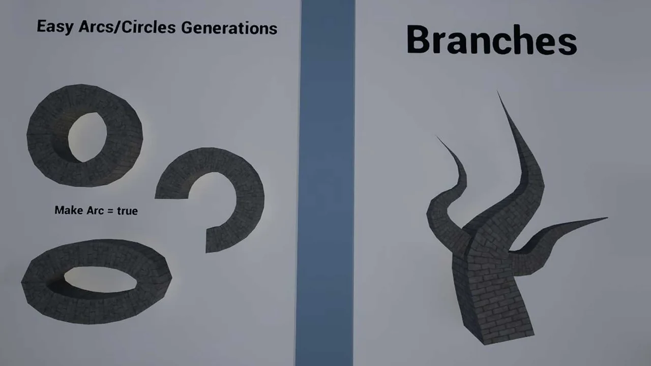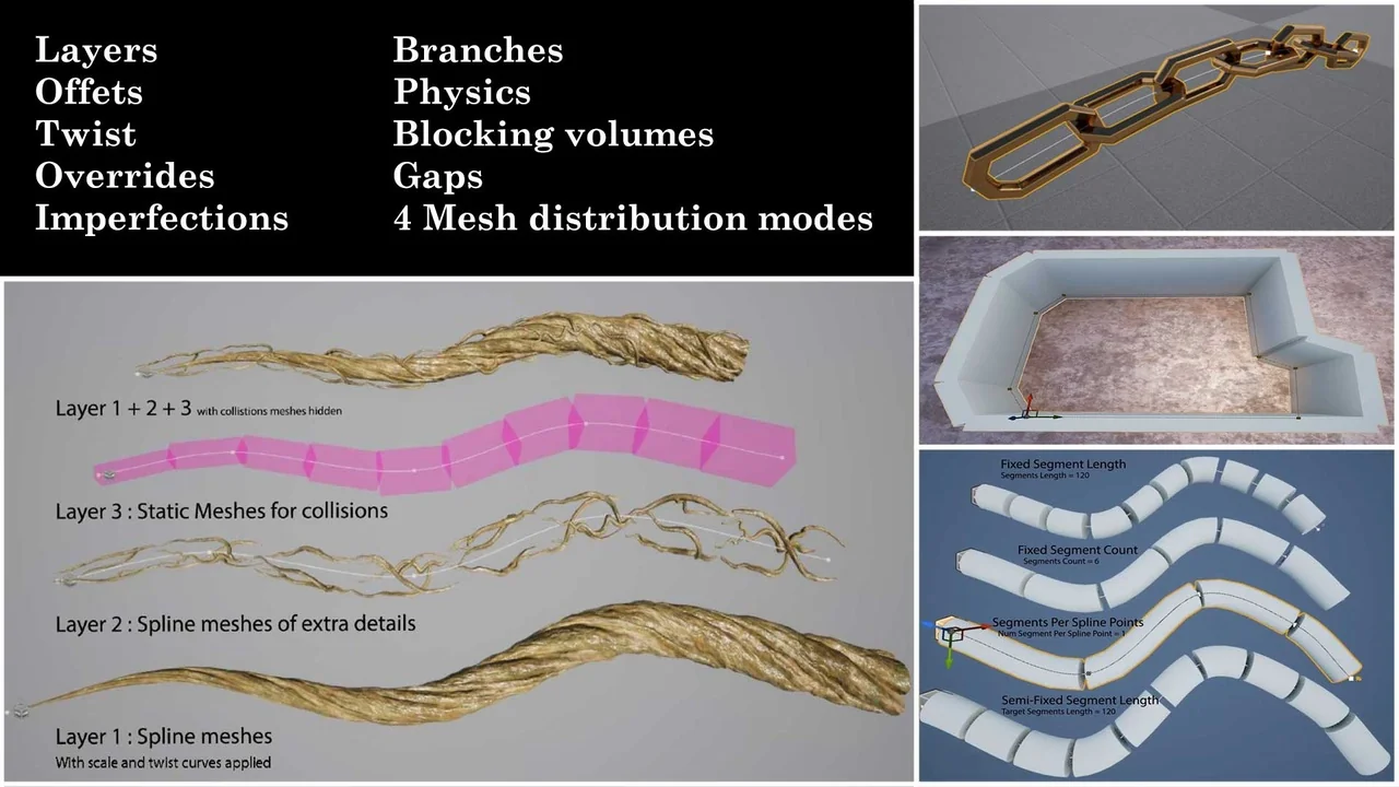 Furthermore, the tool is highly versatile in its application. You can use it to create various environmental elements such as walls, roads, and pipes. It is also effective for generating chains, fences, and even blocking volumes. Because the plugin is built on optimized C++, it ensures performance remains high during development.