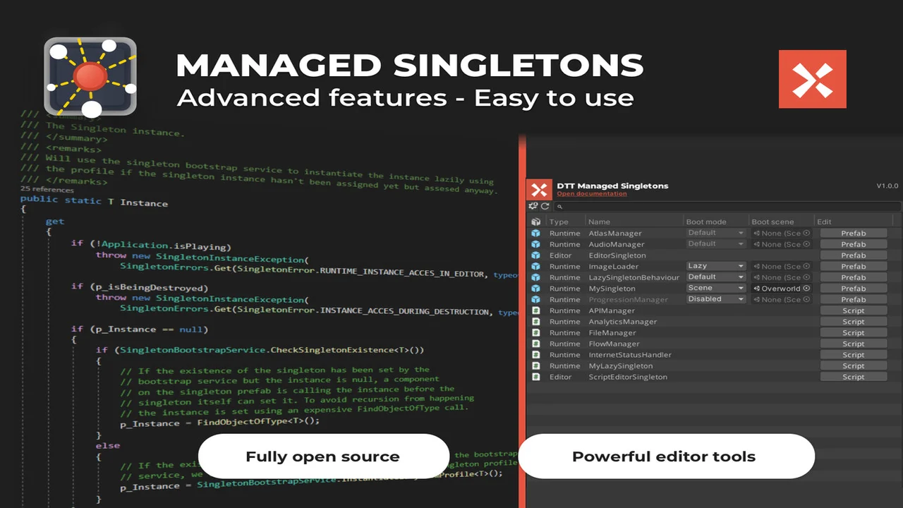 Managed Singletons is a highly customizable and comprehensive Singleton solution that provides a clear overview of the singleton usage within your project, and full control over their activity.