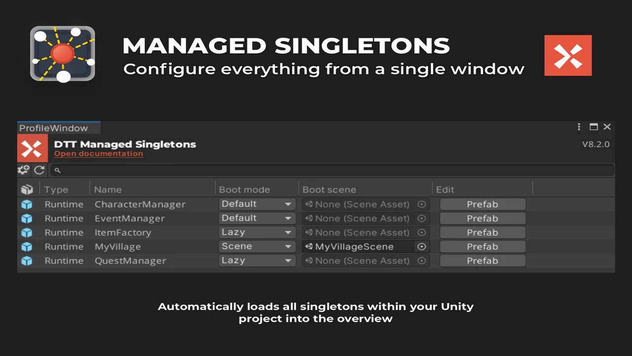 - A clear editor window that provides an overview of singletons you have created in the project and allows you to configure the way your singletons are created during the lifetime of your application.
