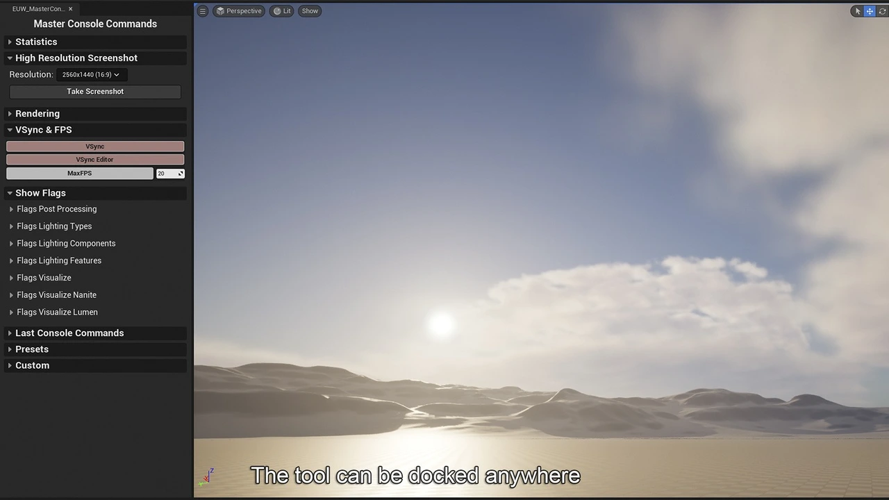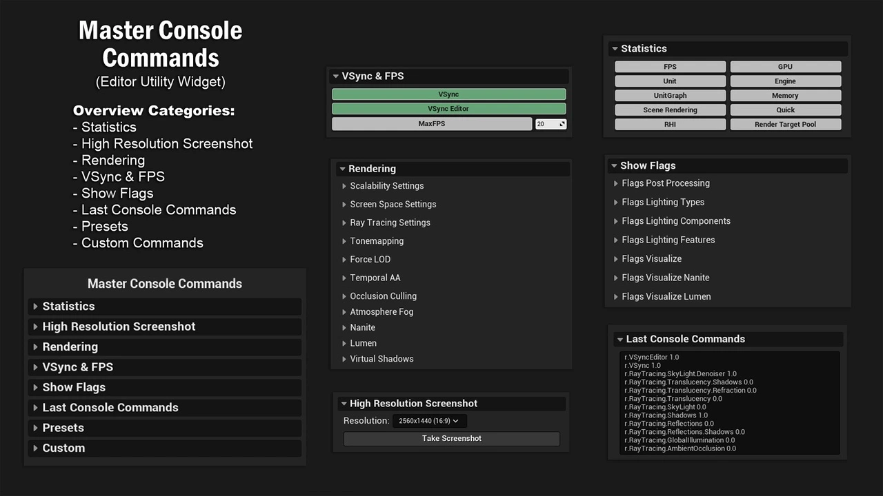Stop memorizing and typing endless console commands. Master Console Commands is the ultimate visual utility that transforms Unreal Engine’s powerful but cryptic command line into an intuitive, click-based UI. This tool is essential for any developer who wants to debug, test, and iterate faster and more efficiently.