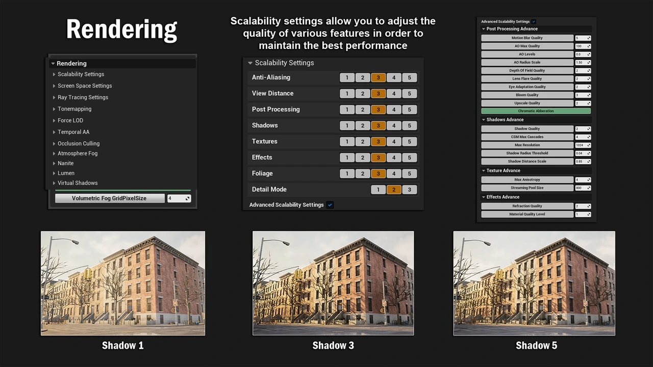 - Rendering & Lighting: Fine-tune everything from occlusion culling and virtual texturing to specific lighting components and features.