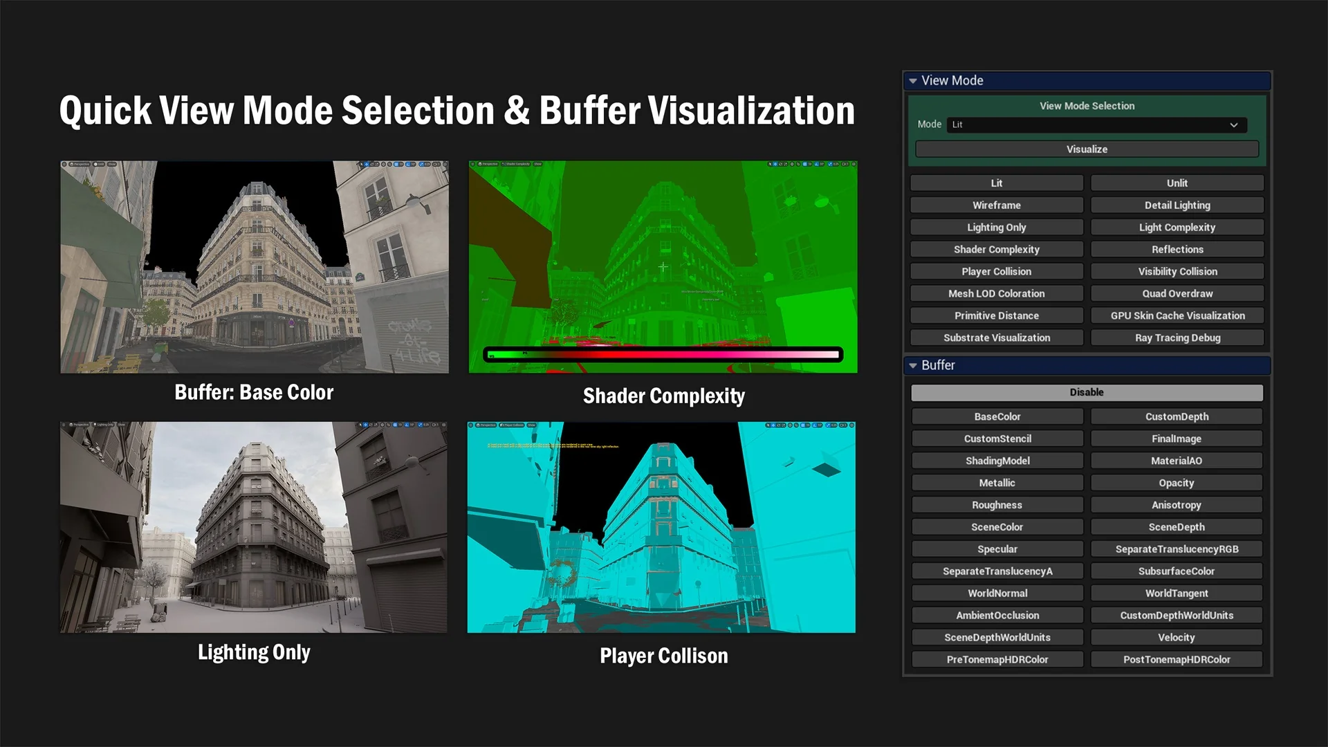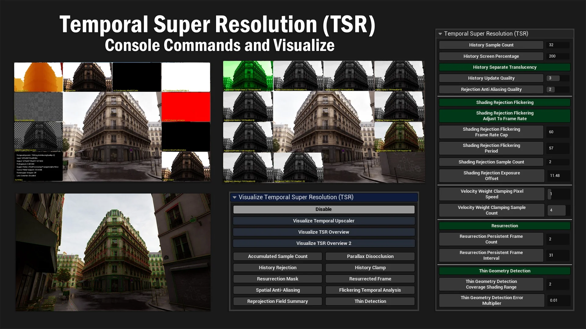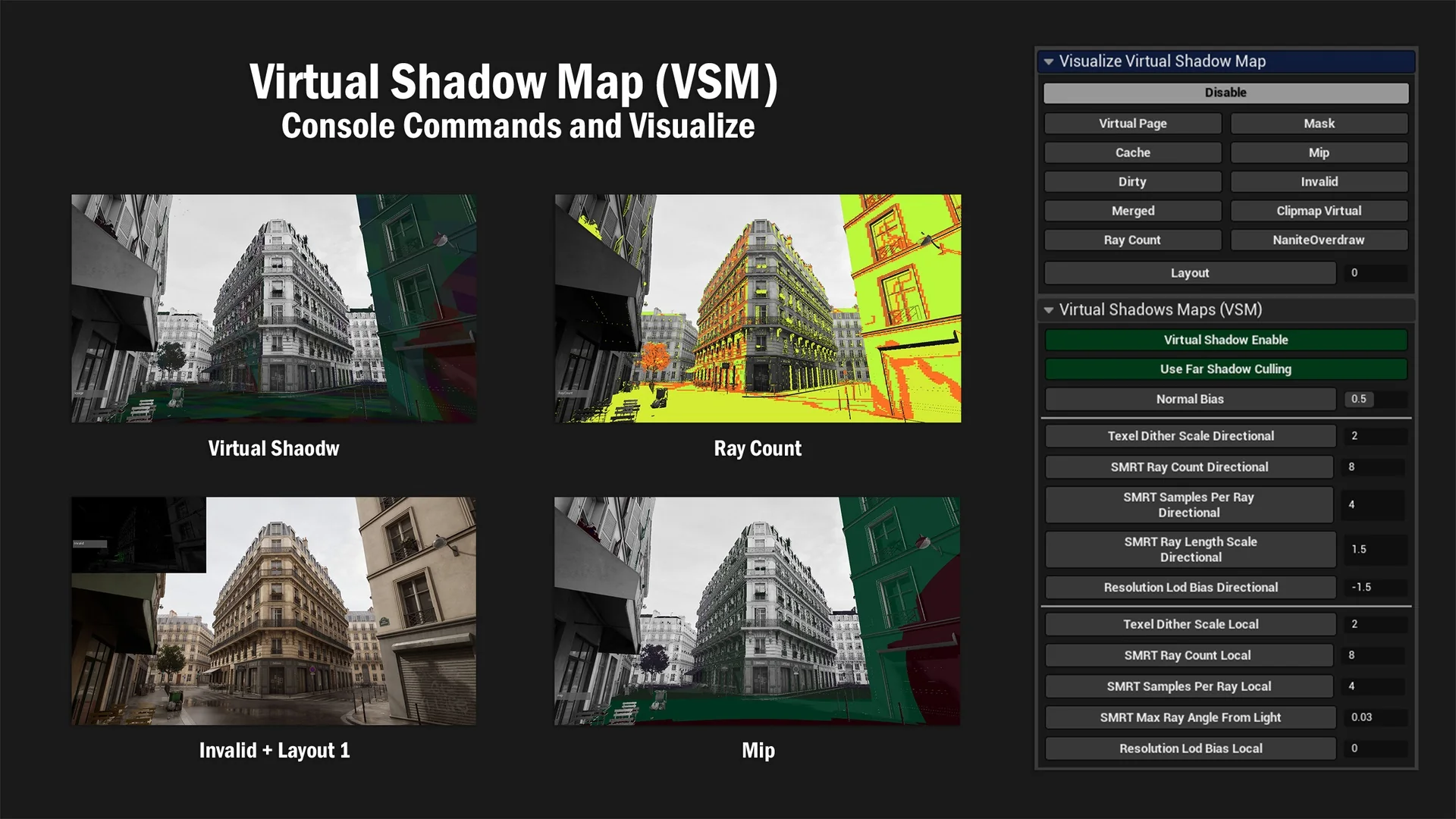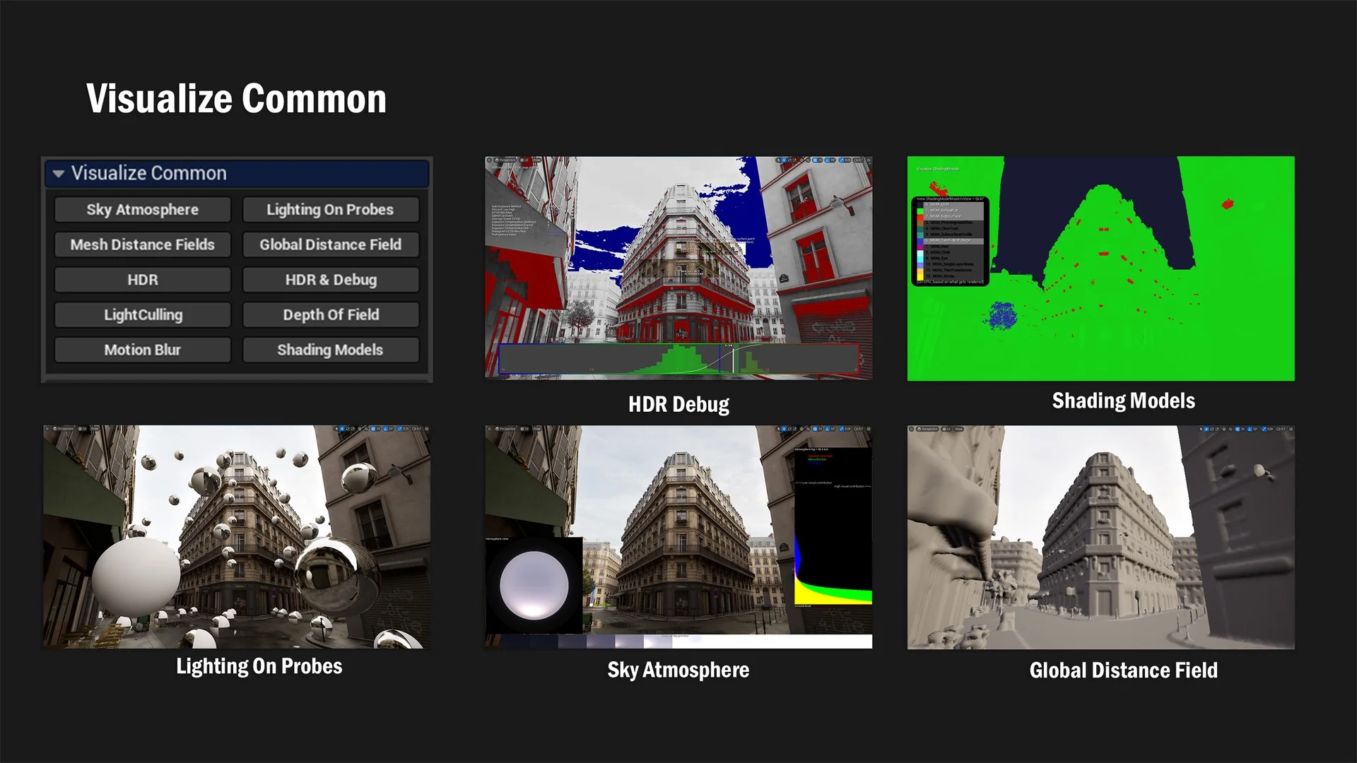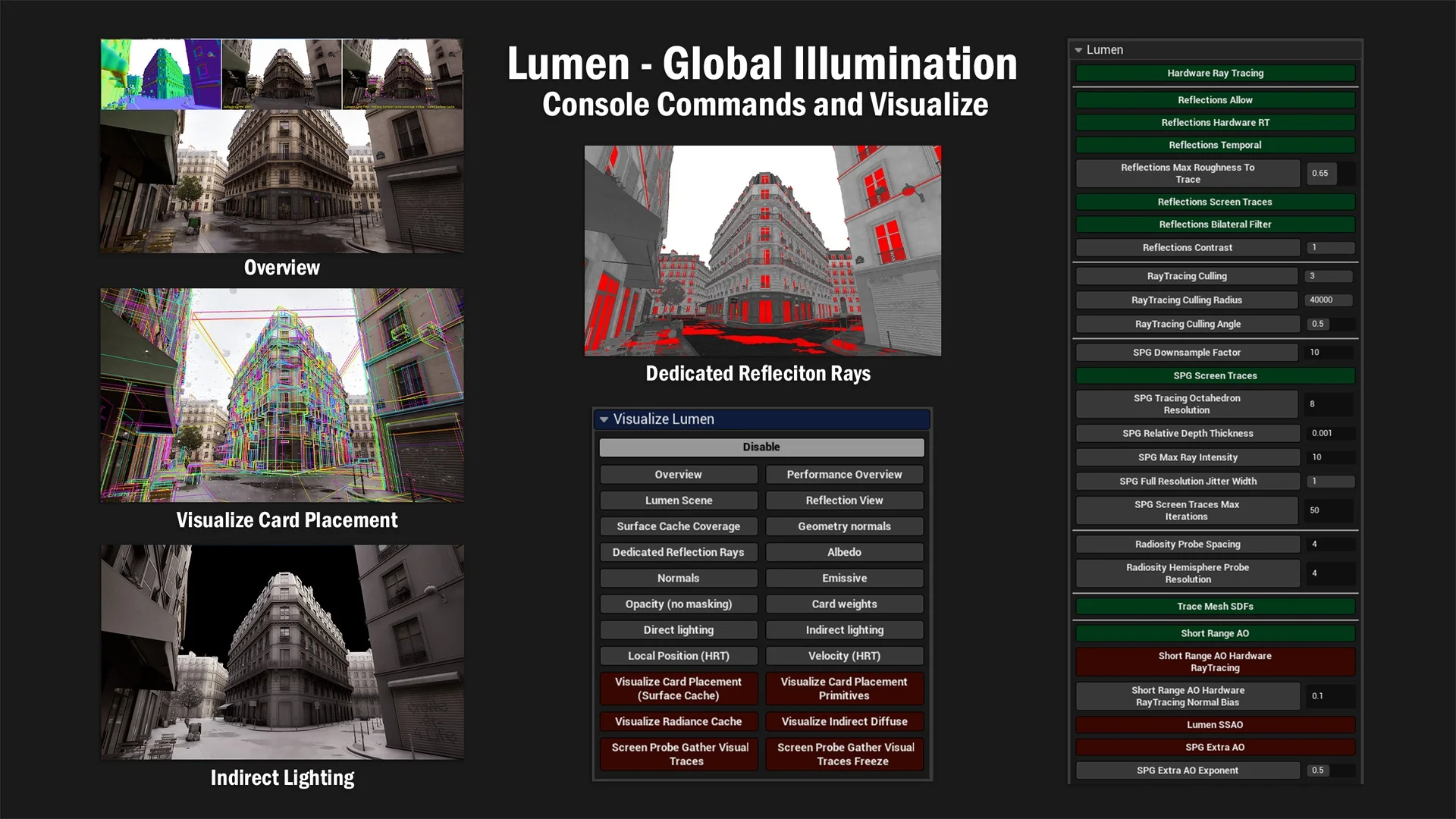 Rendering commands are grouped by specific features such as Lumen, TSR, and Virtual Shadow Maps. These selections represent some of the most interesting and practical rendering-related commands available. Moreover, the tool includes dedicated visualization commands. These are helpful for debugging common issues within Lumen or Virtual Shadow Maps by revealing hidden engine modes.