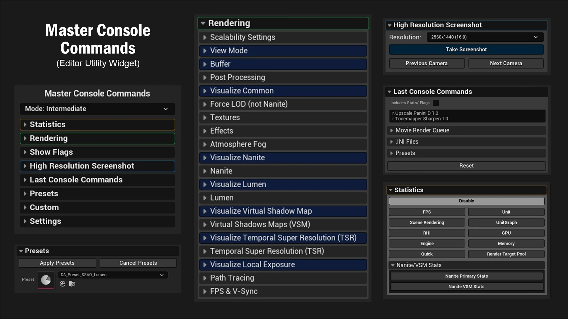 For those using Unreal Engine 4, the Editor Scripting Utilities plugin must be enabled manually. However, this plugin is typically enabled by default in Unreal Engine 5. By streamlining the execution of console commands, Master Console Commands serves as an essential utility for any developer focused on scene diagnosis and performance tuning.