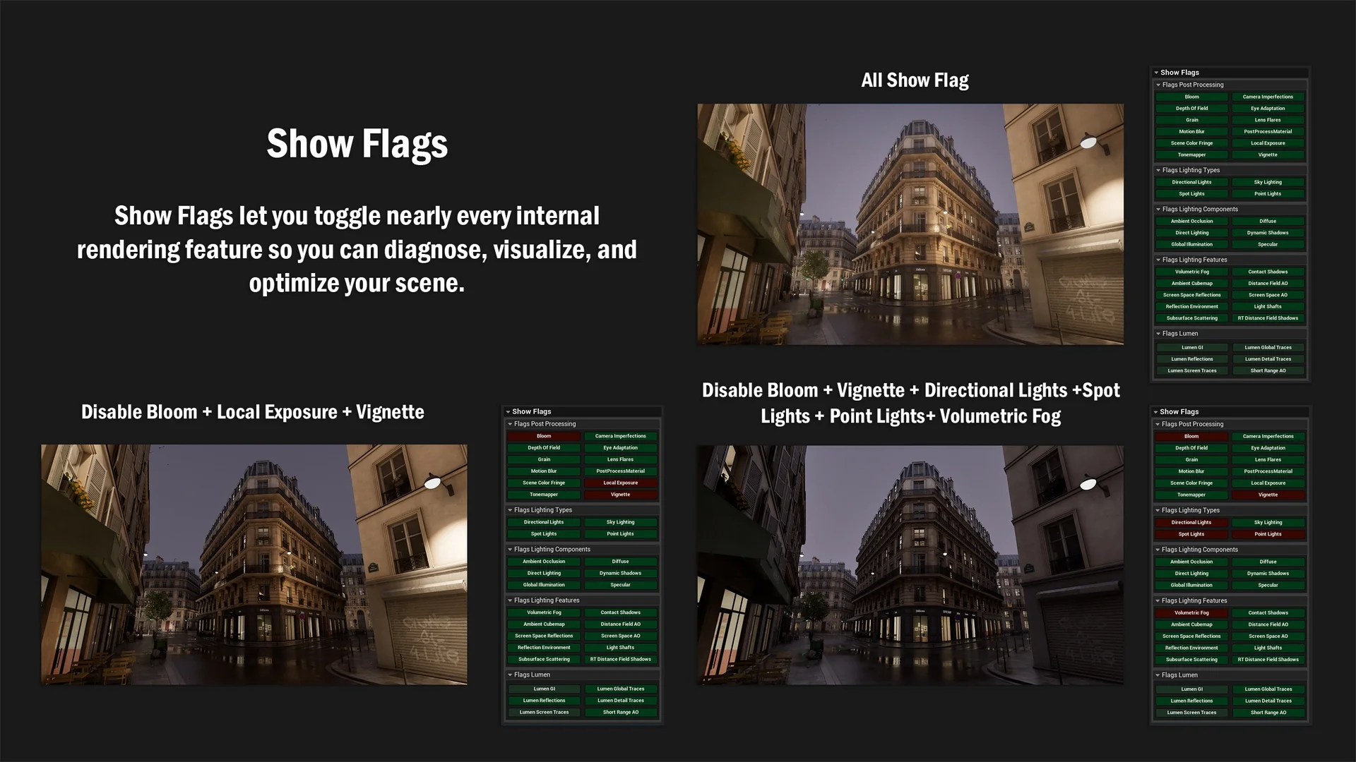 Show Flags allow users to toggle the visibility of specific items within the viewport. For instance, you can hide all spot lights or point lights with a single click. Furthermore, you can control advanced post-processing effects like bloom, local exposure, and volumetric fog. This level of control makes it much easier to isolate specific elements during the optimization process.