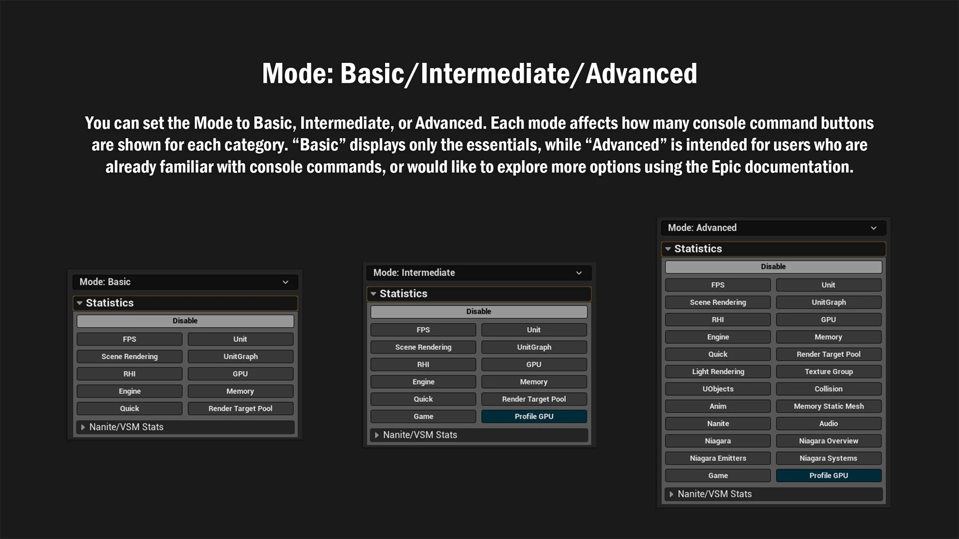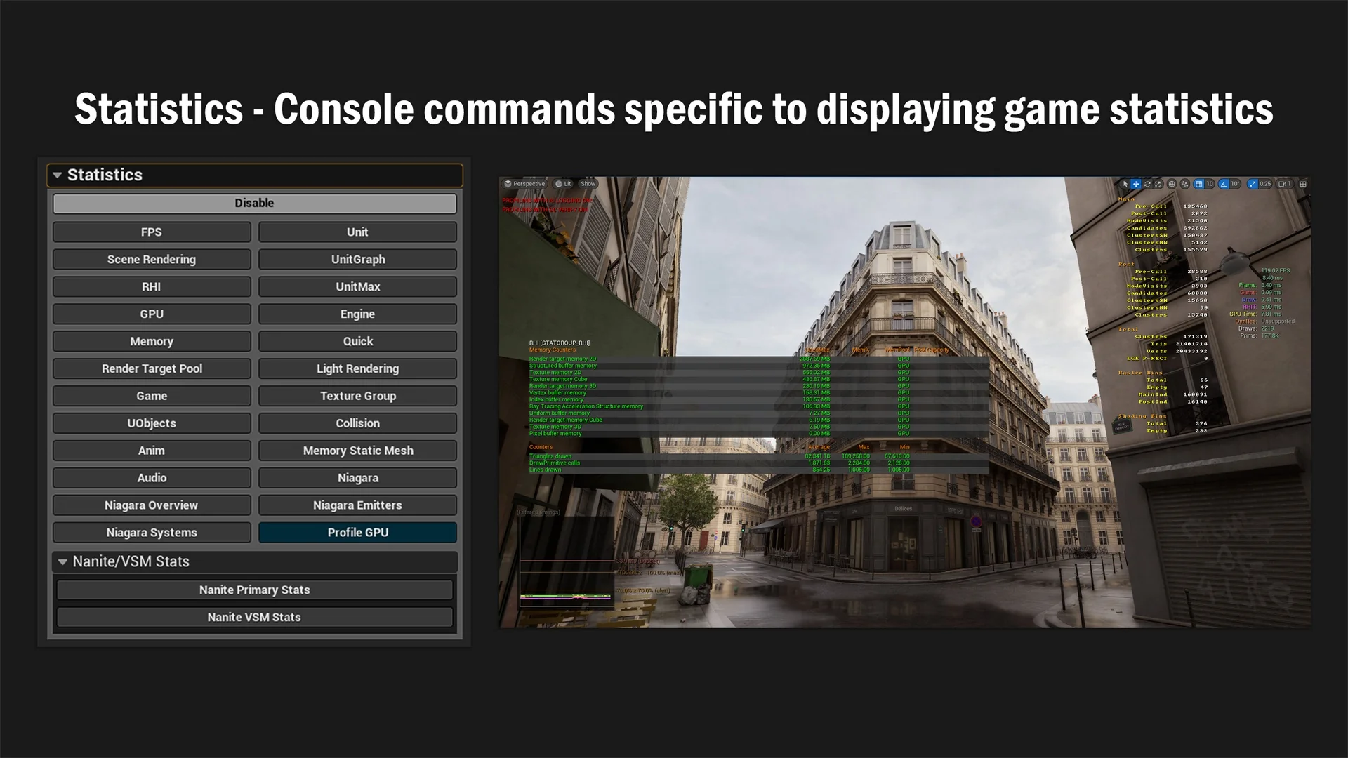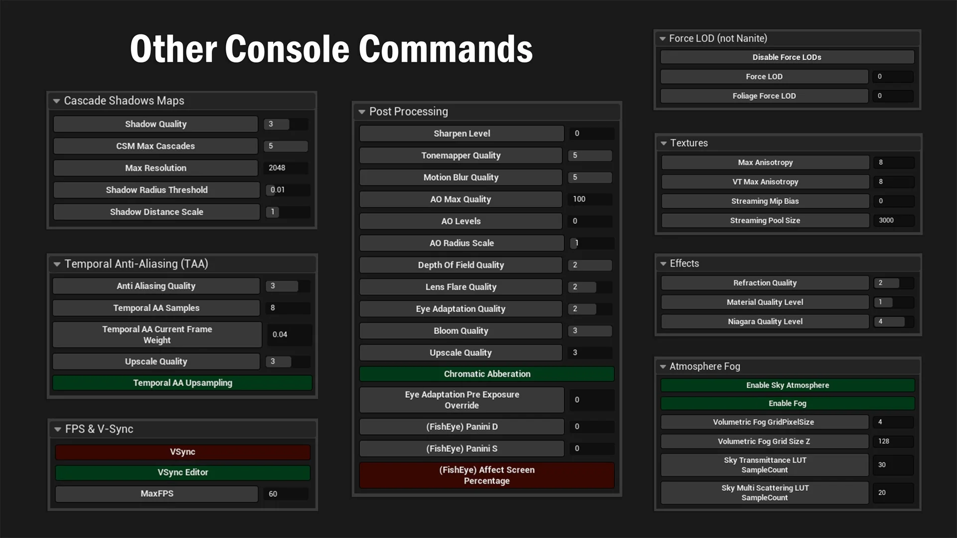 The developer has organized the commands into several useful categories for better navigation. Statistics commands cover essentials like FPS, GPU performance, and SceneRendering. Additionally, more specific systems like Niagara and audio are included, alongside various hidden commands that are often undocumented.