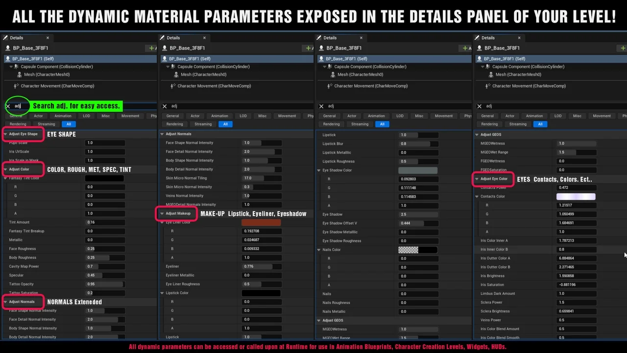 It is meant for teams that want a quicker route into runtime-ready character materials, especially when character appearance needs to be adjusted from the details panel during development or in play. The structure supports game scenarios and integrates with animation blueprints, making it practical for projects where character state can change frequently.