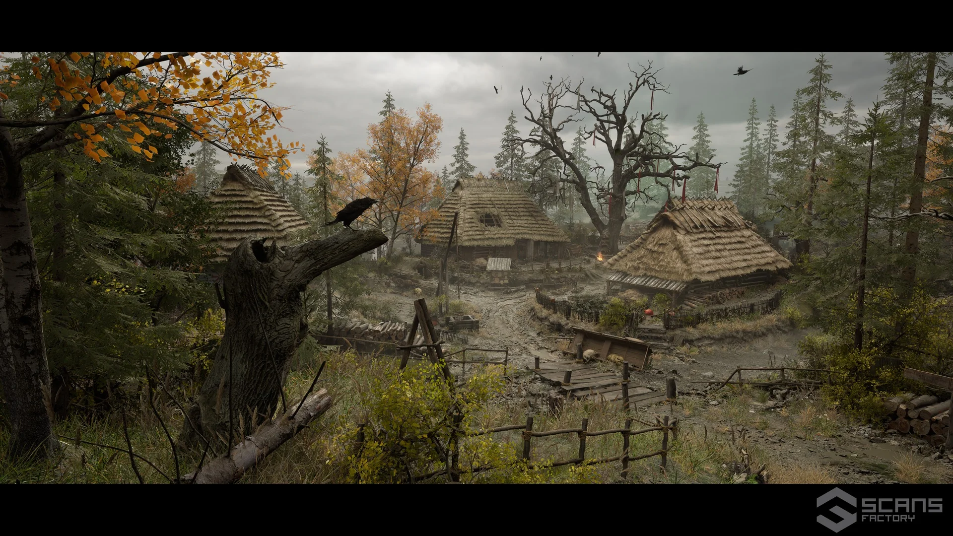 These details help the environment do more than sit in the background. A village with moving ravens, lighting changes, and natural control systems can hold attention during exploration or cinematic framing. At the same time, the scene is optimized for performance, which is important when a location includes architecture, props, landscape elements, lighting features, and animated behavior in the same space.