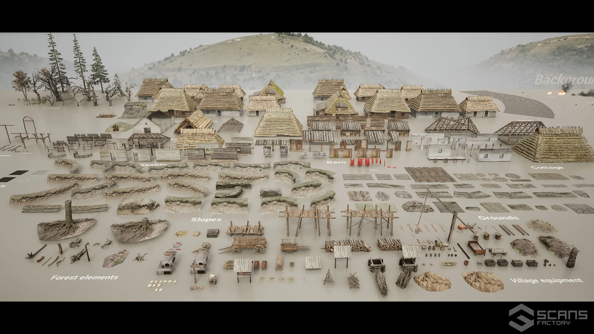 That combination points to a practical workflow: place the modular structures, shape the natural surroundings, adjust the lighting mood, and then add the animated and interactive pieces that bring the settlement to life. The package supports that kind of layered assembly without asking the scene to rely on a single static look.