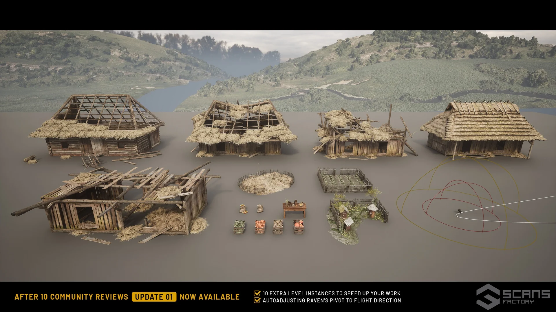 Detailed props reinforce that identity, and the modular approach matters in production because it makes arrangement and revision easier. Update 01 added a new set of building and environment level instances to speed up and simplify the creation process, which supports the kind of layout work that often happens when a village needs to be tested from several angles. That makes the environment easier to place into a scene where paths, cluster spacing, and sightlines need to be adjusted without rebuilding the whole setup.
