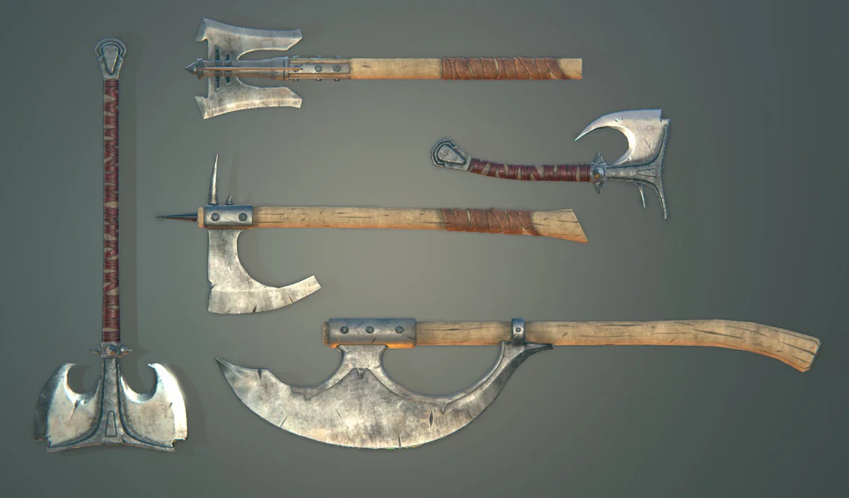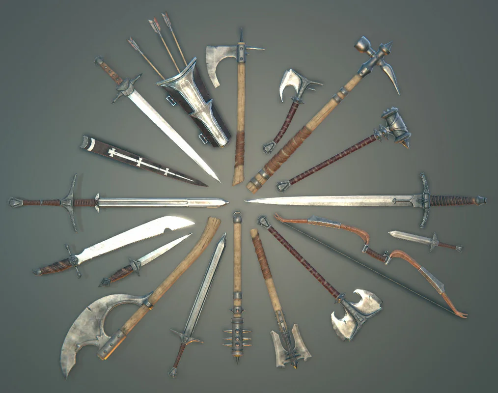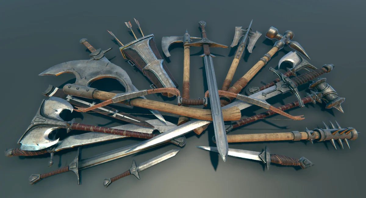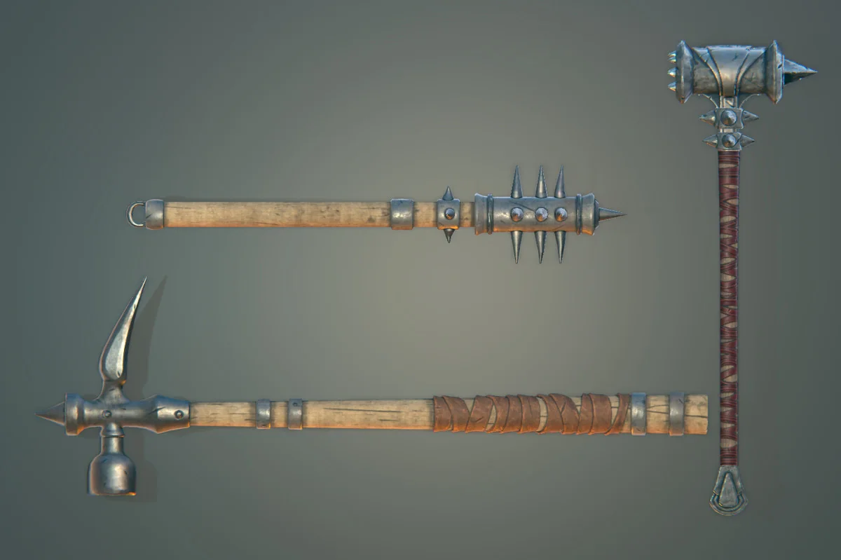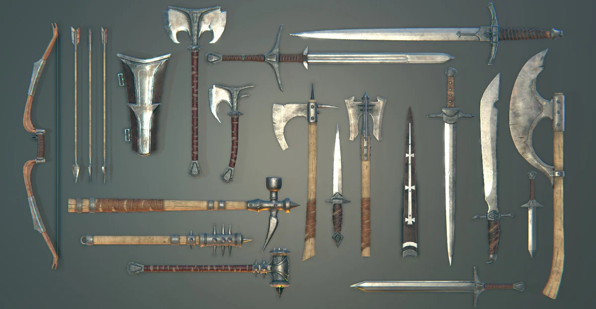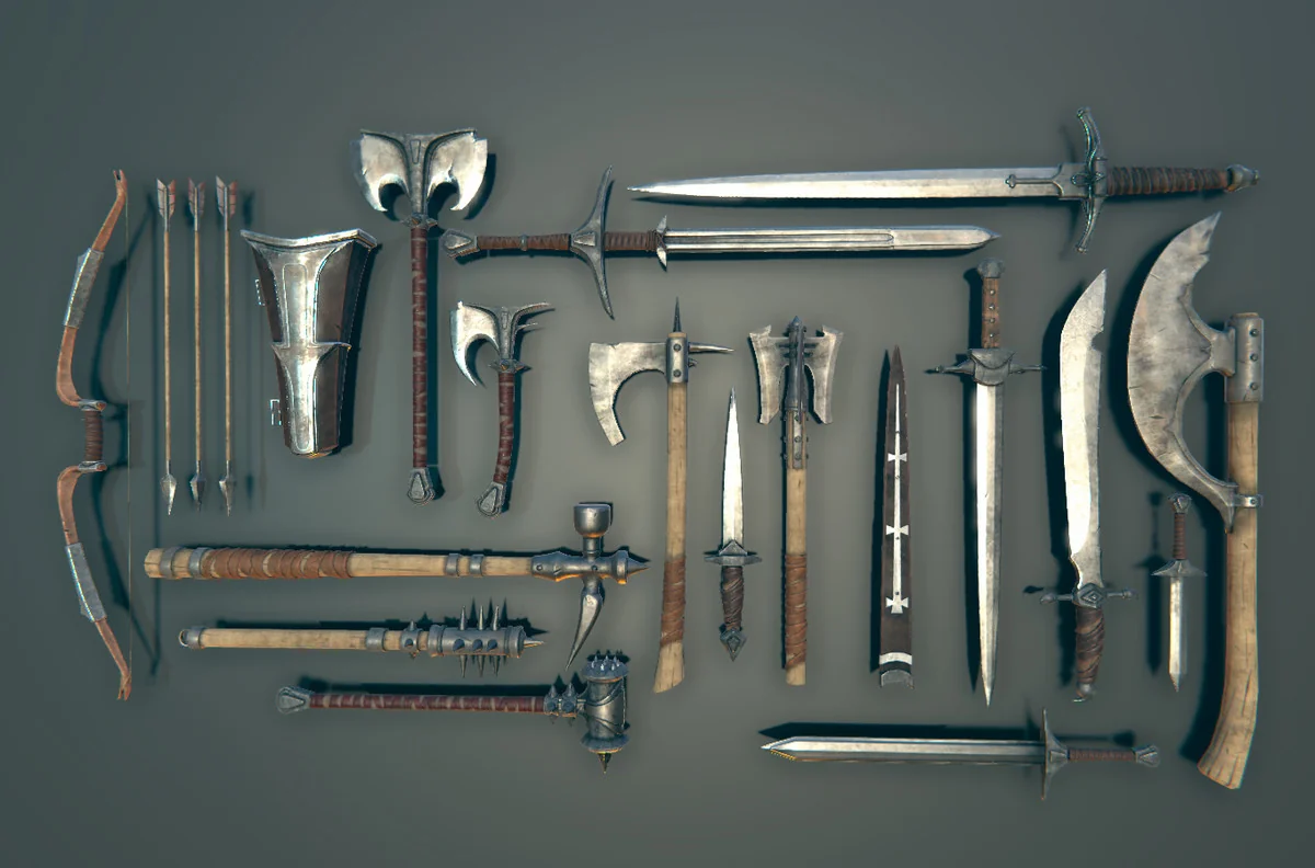 The melee components consist of 15 unique models. This includes five different sword designs, providing variety for standard infantry or hero characters. Notably, one of these swords is accompanied by a dedicated sheath, which allows for more realistic character animations where the weapon is drawn or stowed. Beyond swords, the kit contains five different axe models and three maces, catering to heavy-hitters and brute-force combat styles. Two daggers are included to round out the melee selection, offering options for stealth-based mechanics or secondary sidearms.