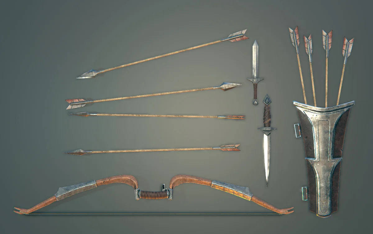 A significant feature of this package is the inclusion of a fully functional bow system. Unlike the static melee models, the bow is provided with its own rig and specific animations. This includes both an idle animation and a shooting animation, which reduces the technical overhead required to implement ranged combat. To complete the set, the package includes a quiver and a separate arrow model, providing the necessary sub-assets for a projectile-based combat loop.