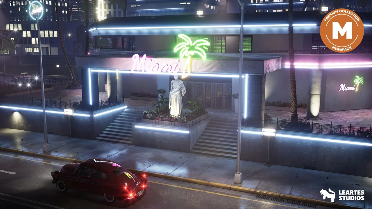 The Miami Club Megapack is set up as a full nightclub environment rather than a loose collection of props. It includes a showcased, preassembled scene with over 784 unique meshes, giving the environment a dense and detailed feel from the start. The focus is on a luxury nightclub atmosphere, with VIP lounges, dance floors, and vibrant bars shaping the layout.