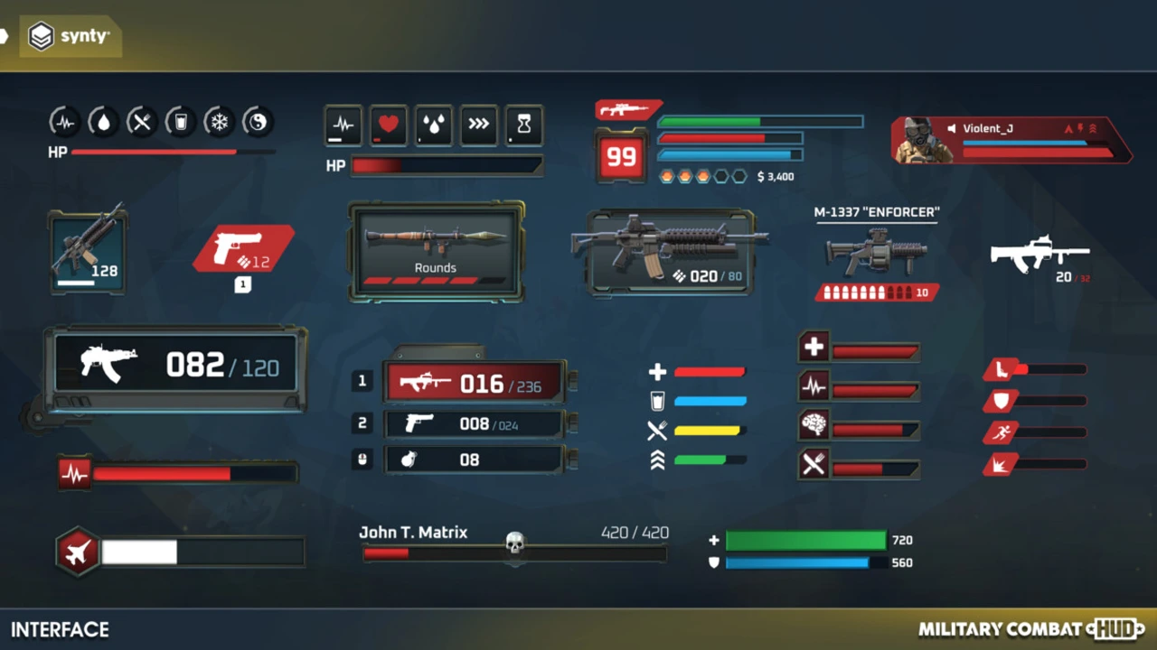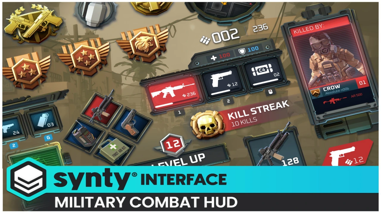 This pack is loaded with over 200 animated prefabs and 1,500+ sprites and icons. It covers all the essentials you’d expect, including action bars, compasses, minimaps, and weapon wheels. Furthermore, it includes a full suite of components specifically for competitive shooters: