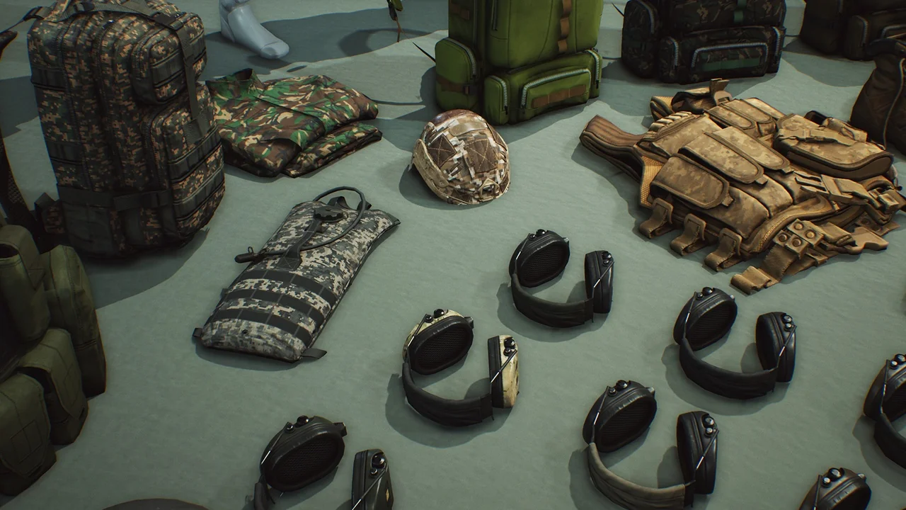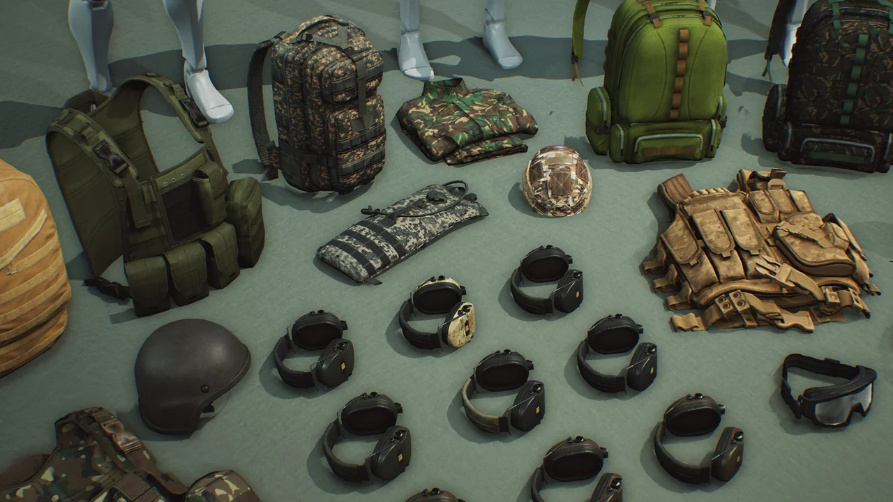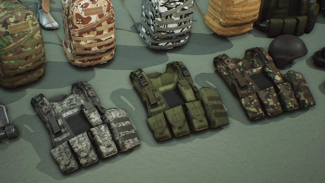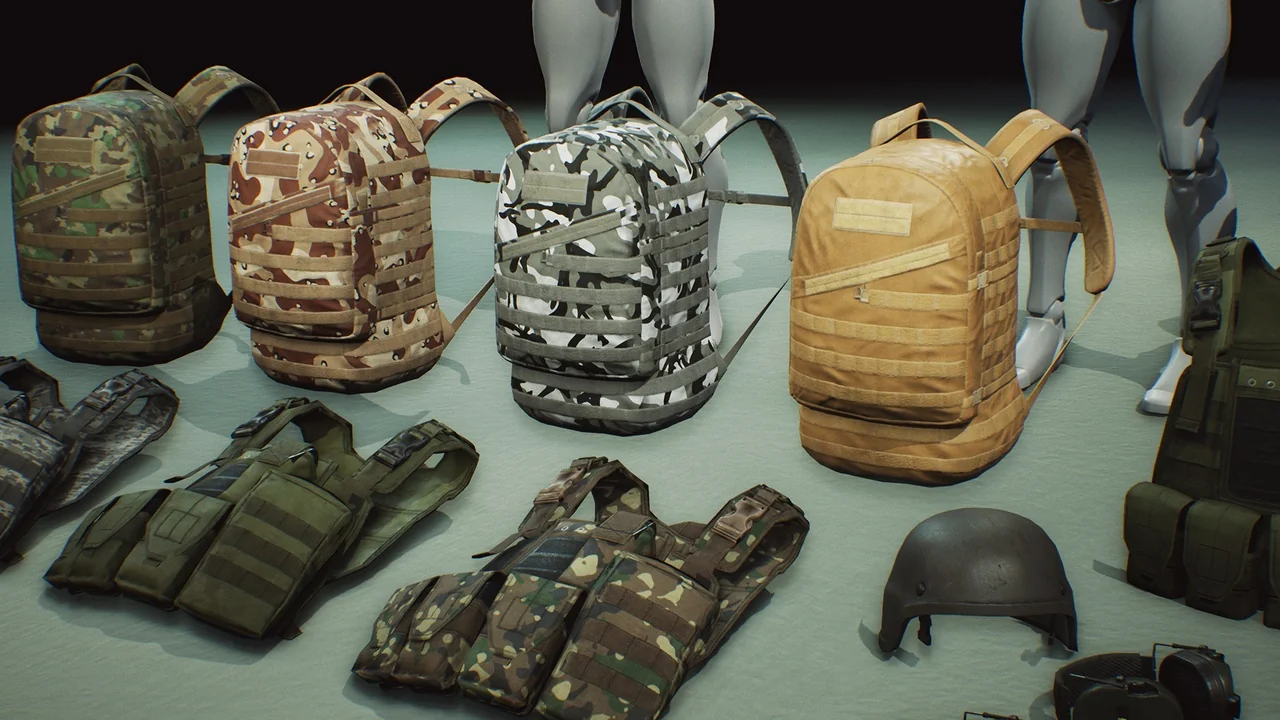 The pack includes a variety of tactical gear such as vests, helmets, and backpacks. Each asset is fully detailed from all sides to ensure they look great from any angle. In addition, the developers included multiple texture skins. These options allow you to change the appearance of the gear with different camouflage patterns easily.