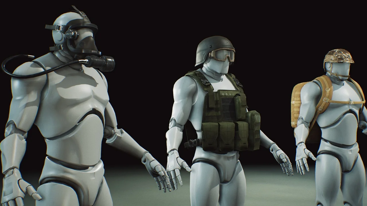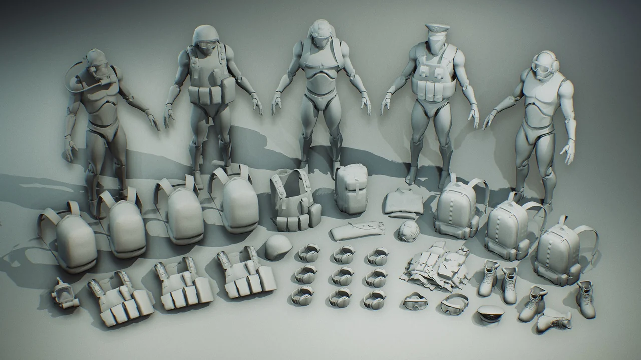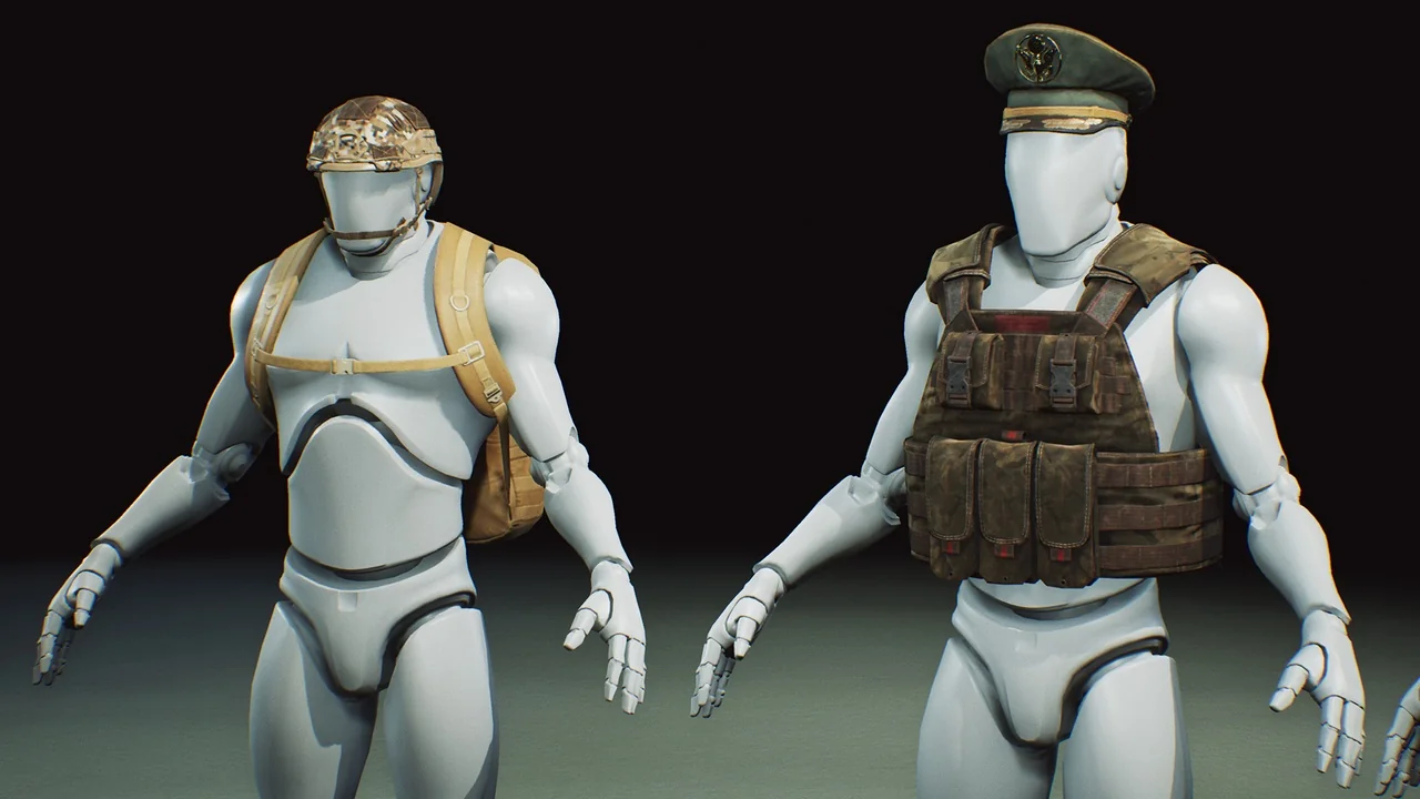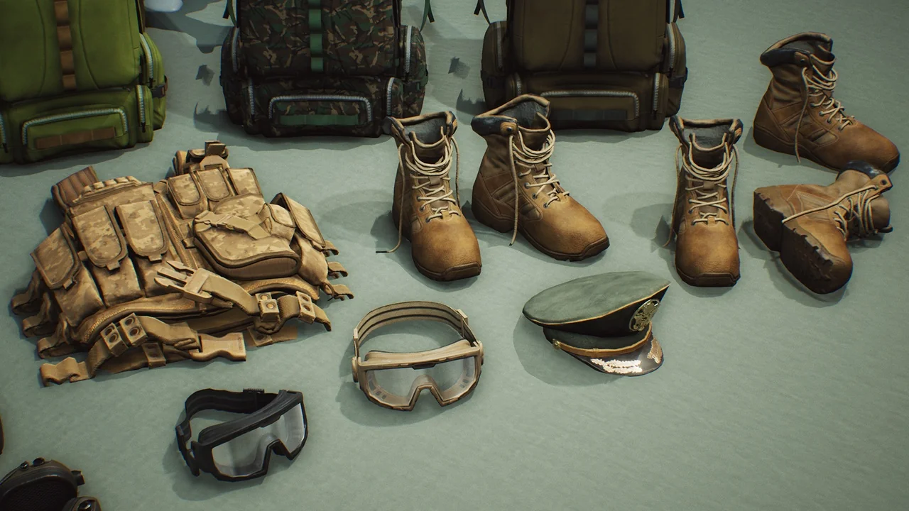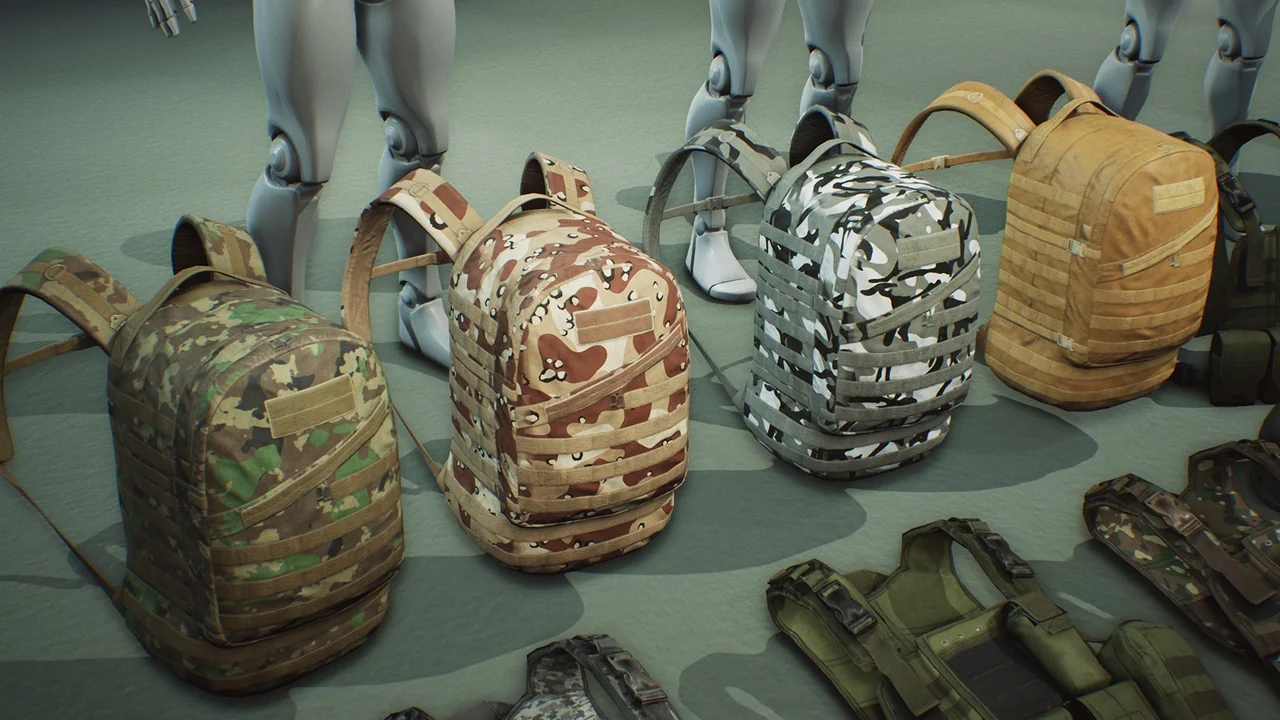 The pack includes a variety of tactical gear such as vests, helmets, and backpacks. Each asset is fully detailed from all sides to ensure they look great from any angle. In addition, the developers included multiple texture skins. These options allow you to change the appearance of the gear with different camouflage patterns easily.