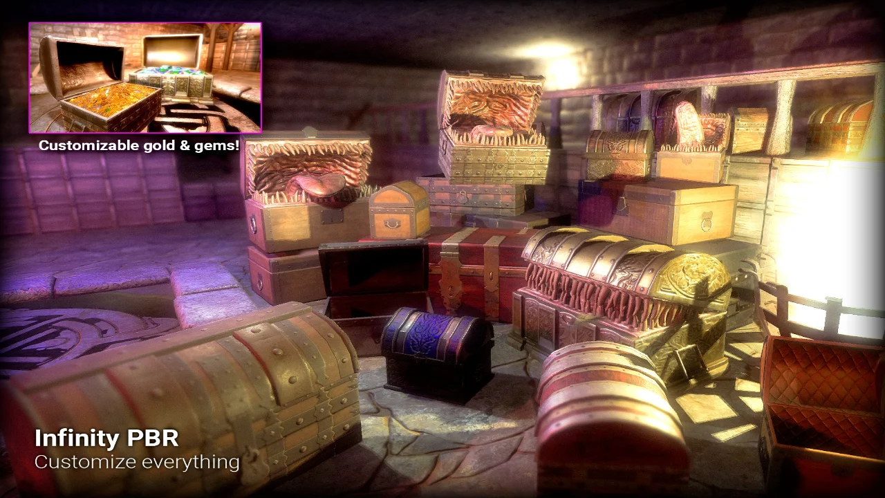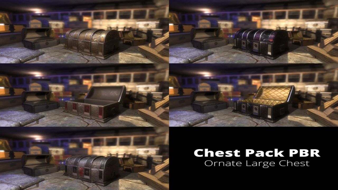 Mimics & Chests Pack PBR is really 11 different chests in a variety of sizes and styles combined with a Mimic monster that fits in 10 of those boxes! They range from cheaper wooden box-type chests to ornate, fancy, gold filled chests. Each one has it’s own pre-made look, but can have it’s metal & wood materials be changed using a huge variety of metals and woods. 5 Pre-exported texture sets are included.