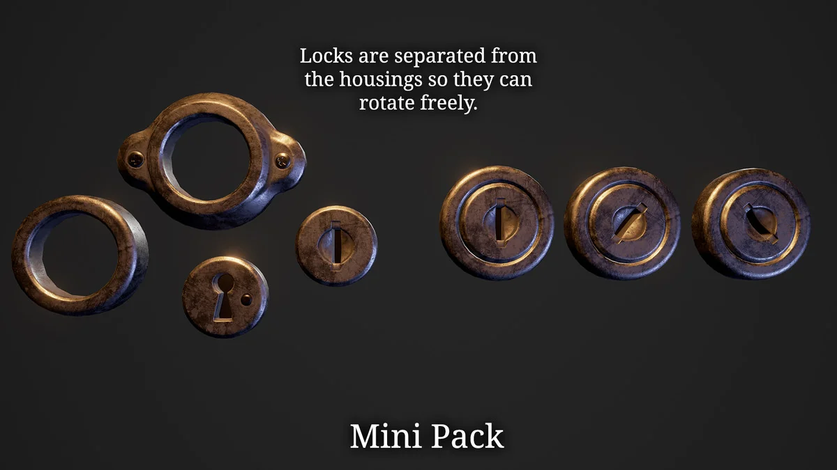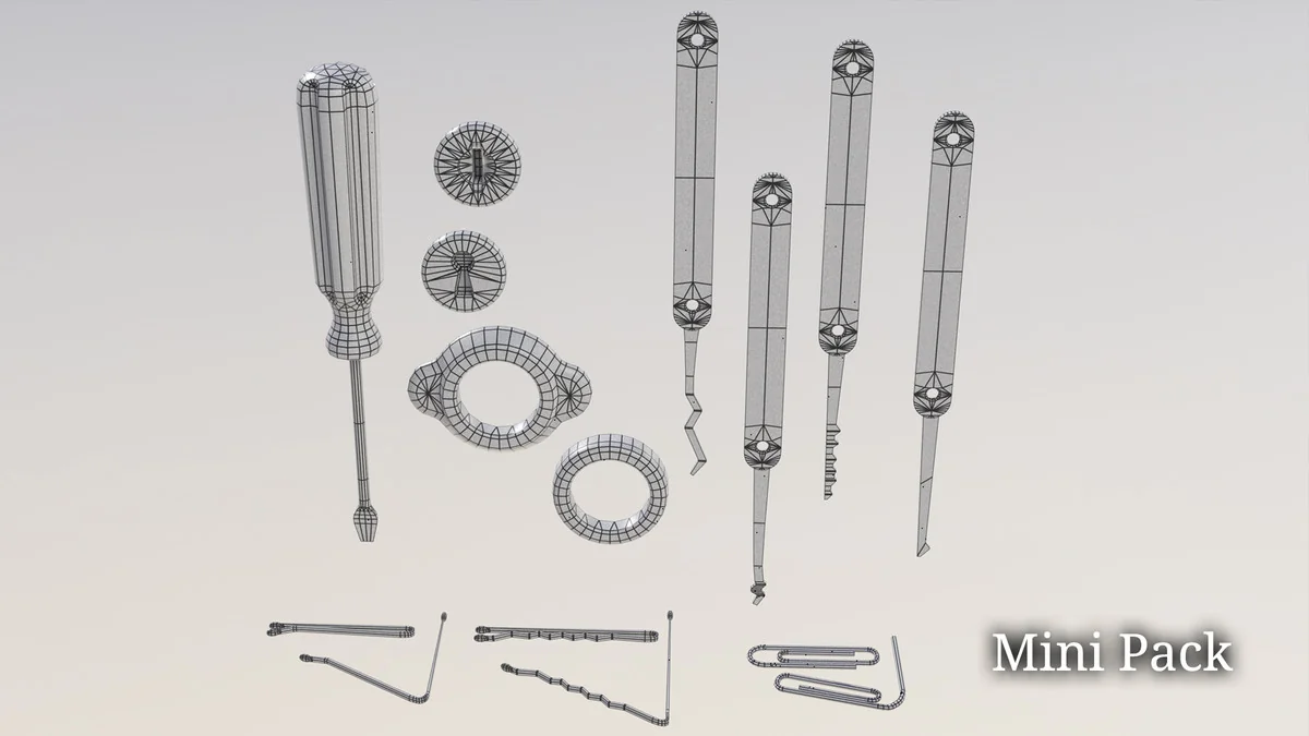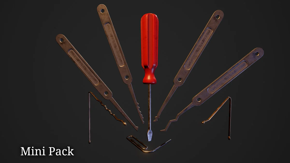 The Mini Pack: Lockpick Kit functions as a production shortcut for titles requiring interactive security mechanics. By providing the separated lock and housing meshes alongside a variety of picking tools, it covers the visual requirements for a standard lockpicking interface. Developers can implement their own rotation logic and collision detection using these optimized meshes as the primary visual drivers.