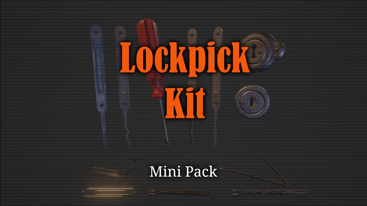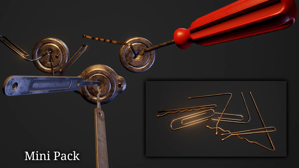 The Mini Pack: Lockpick Kit is a targeted collection of 3D art assets designed specifically for developers building lockpicking mini-games. Rather than including gameplay logic or scripting, this package focuses entirely on the visual requirements of a thievery-based mechanic. It provides the physical objects a player would interact with, ranging from the mechanical components of a lock to the various tools used to bypass them.