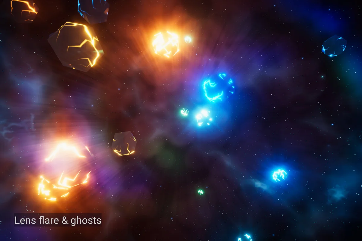 Lens flare is handled procedurally and includes halo, ghosts, and presets. Glare works in a different direction, creating glare light streaks that fade into the glow based on blending, with presets available there as well. Each part serves a different visual role, so the final result can stay restrained or become much more pronounced depending on how the controls are used.
