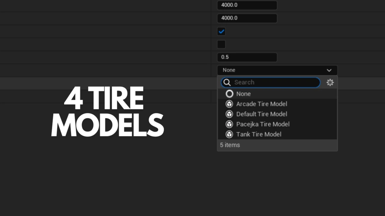 - Realistic Tire Models: Choose from a range of tire models, including the default model, the industry-standard Pacejka model, an arcade model, and a tank model to perfectly fine-tune vehicle handling.