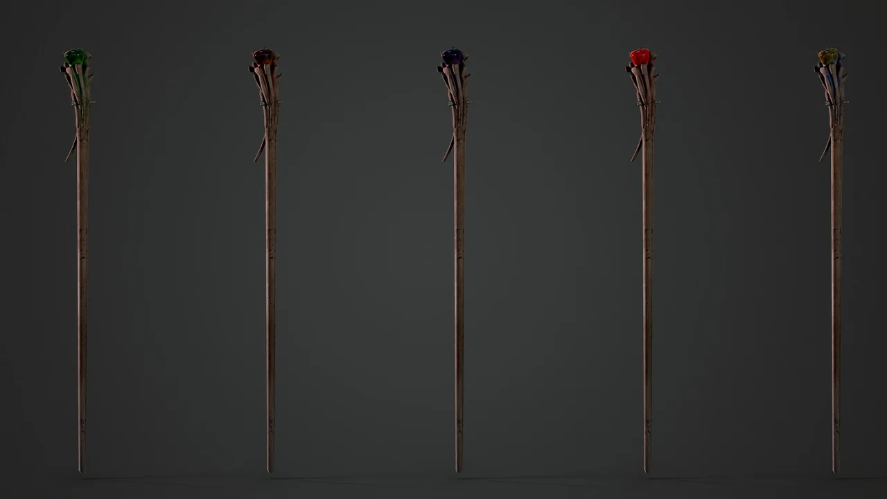 Whether your scene is a dark dungeon or a bright desert, the materials will react realistically. The staff also includes five color variations for the magical elements. You can choose between Violet, Orange, Red, Green, and Yellow. These options allow you to match the staff to the mage’s specific elemental powers.