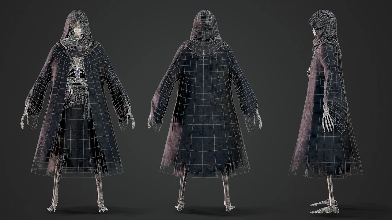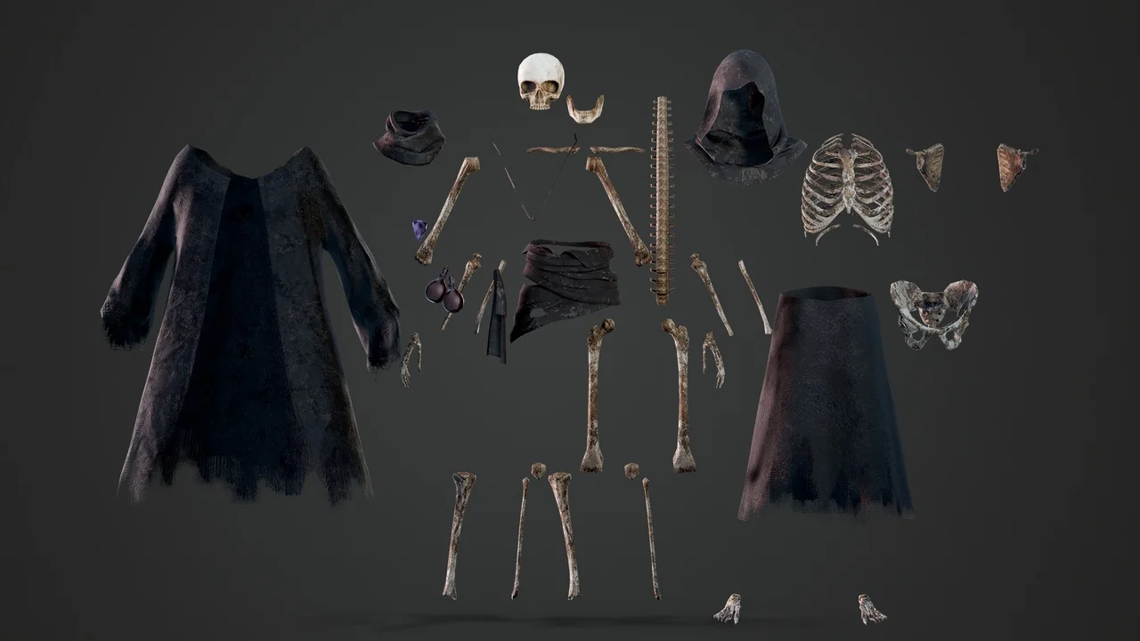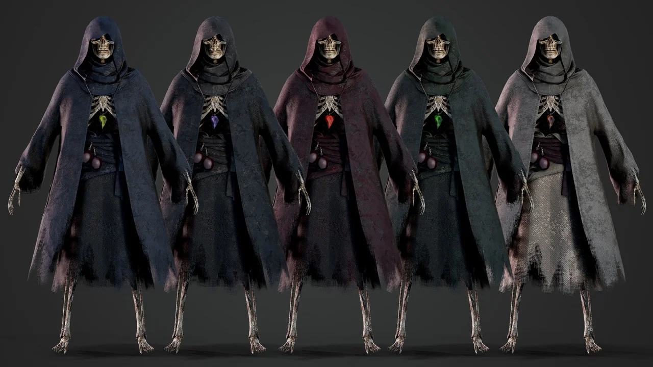 Modularity is a core feature of this asset. For example, the skeleton and clothing are separate components. You can choose to use the full-clothed version or the bare skeleton. Furthermore, the developer included six texture sets for different parts of the model. These sets cover the skull, body, hood, jacket, belt, and staff.