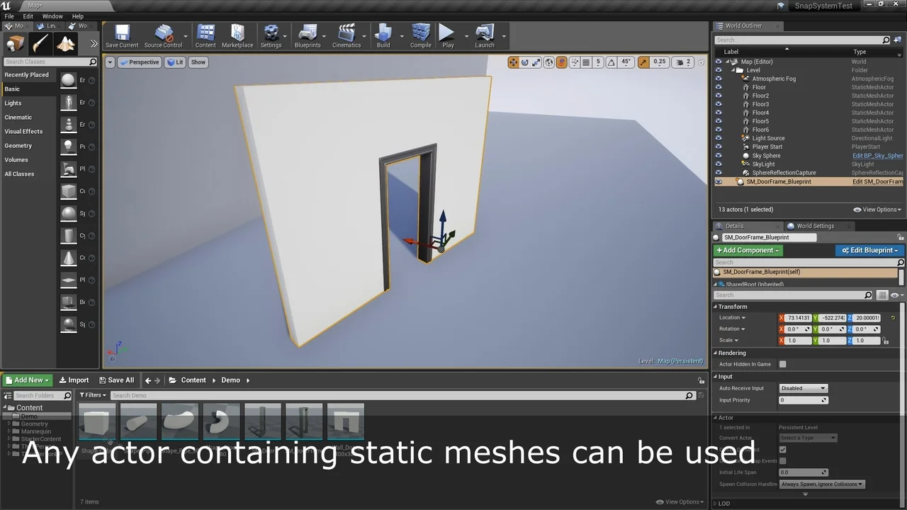 The core functionality of the system relies on a “snap socket to socket” concept. Because it uses sockets, you can easily prepare existing meshes for the system. This process requires no coding or Blueprint modification. Therefore, you can integrate the Modular Snap System into your project quickly by simply adding sockets to your components.