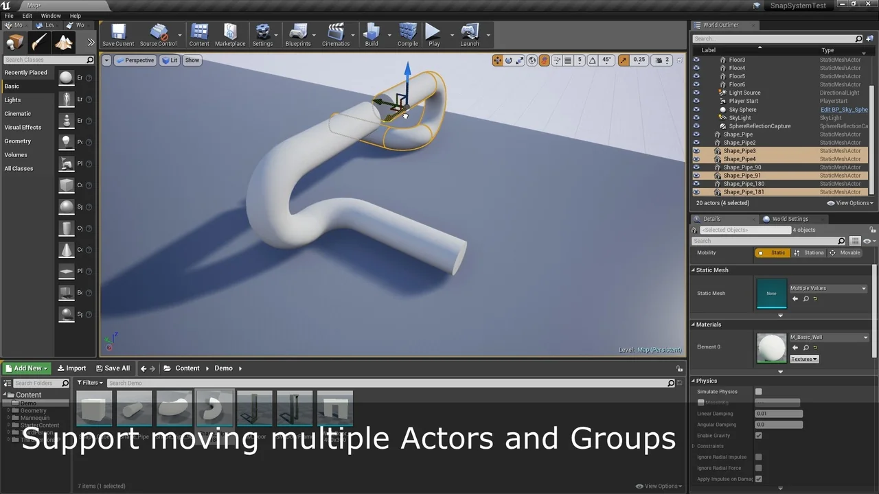 Managing large scenes is easier with support for multiple selections and groups. When you select several actors, the system snaps them all as a single unit. However, the plugin also functions at the component level for more granular control. By default, it aligns actors, but you can also choose to attach them to the snap target component. Another useful feature is the ability to move the selection pivot directly to the snap point.