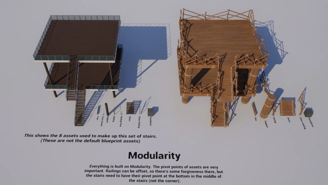 This blueprint fits best in projects where stairs need to adapt to different layouts rather than stay tied to a single modular kit arrangement. The described behavior makes it useful when a scene needs stairs that can be resized, reconfigured, or matched to user-selected assets. Because the setup automatically recalculates sizes and locations as it is scaled, it can save time when a scene calls for a different stair height or proportion than the one originally built.