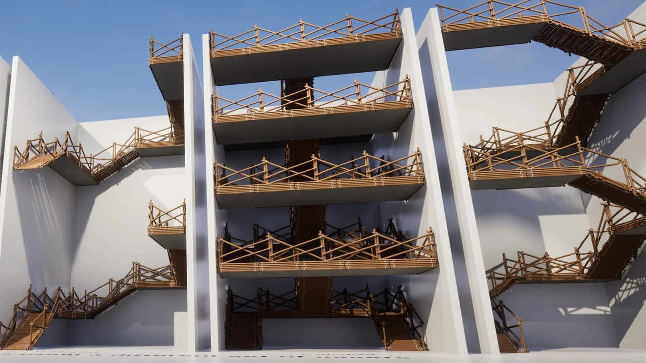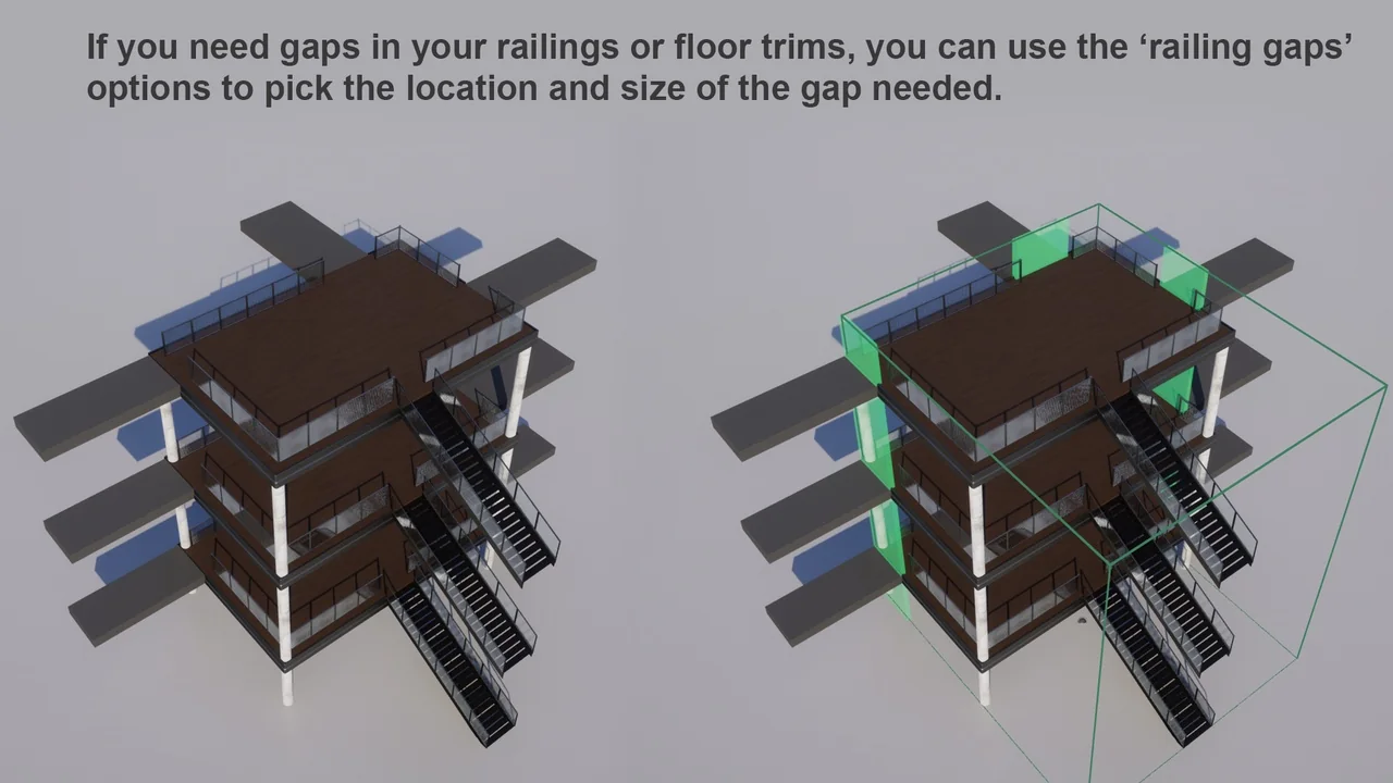 It also suits workflows where visual variation matters. The ability to swap in custom assets, control materials, move railings away from edges, and adjust pillar positions gives the staircase more room to match a specific environment. Those controls make it easier to keep the stair assembly consistent with the rest of the scene instead of treating it as a separate fixed prop.