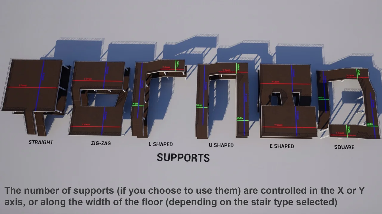 There are also controls for individual materials, draw distances, railing offsets, and pillar placement. The railing offsets can pull the railings away from the edges, which gives extra room for fitting the stair set into different spaces. Pillar controls work independently in the X and Y directions, giving more room to adjust the structural look of the stairs without reshaping the entire setup.