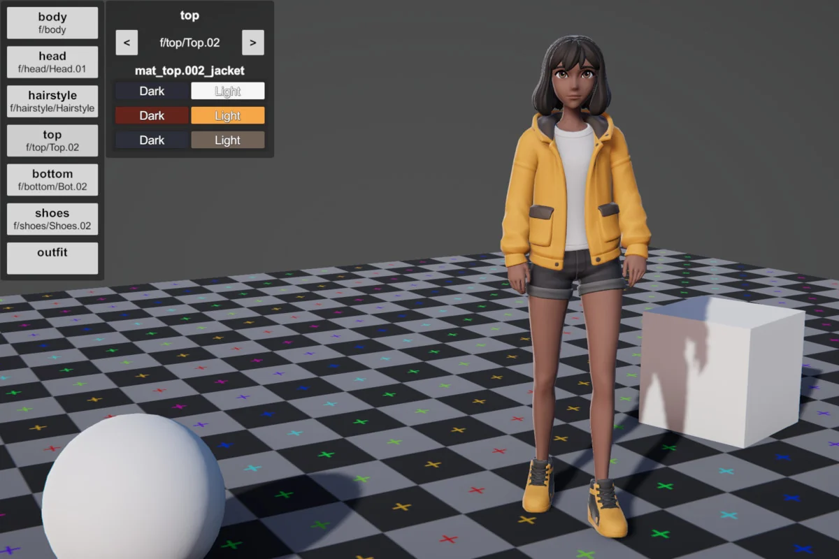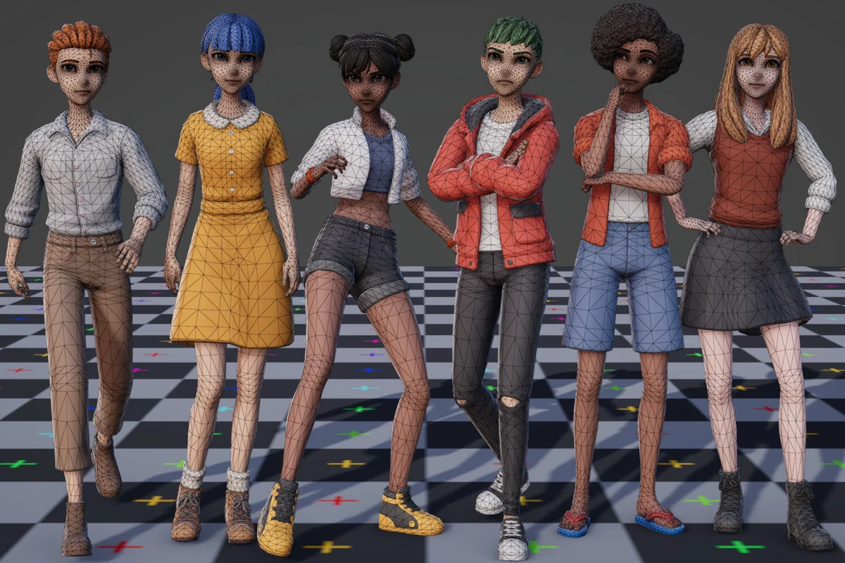 Performance is managed through varied polygon counts and texture resolutions tailored to specific body parts. The total polycount for a character ranges from 11,000 to 22,000 triangles, depending on the complexity of the chosen outfit and accessory combination. This range balances visual fidelity for stylized projects with the performance requirements of real-time rendering.
