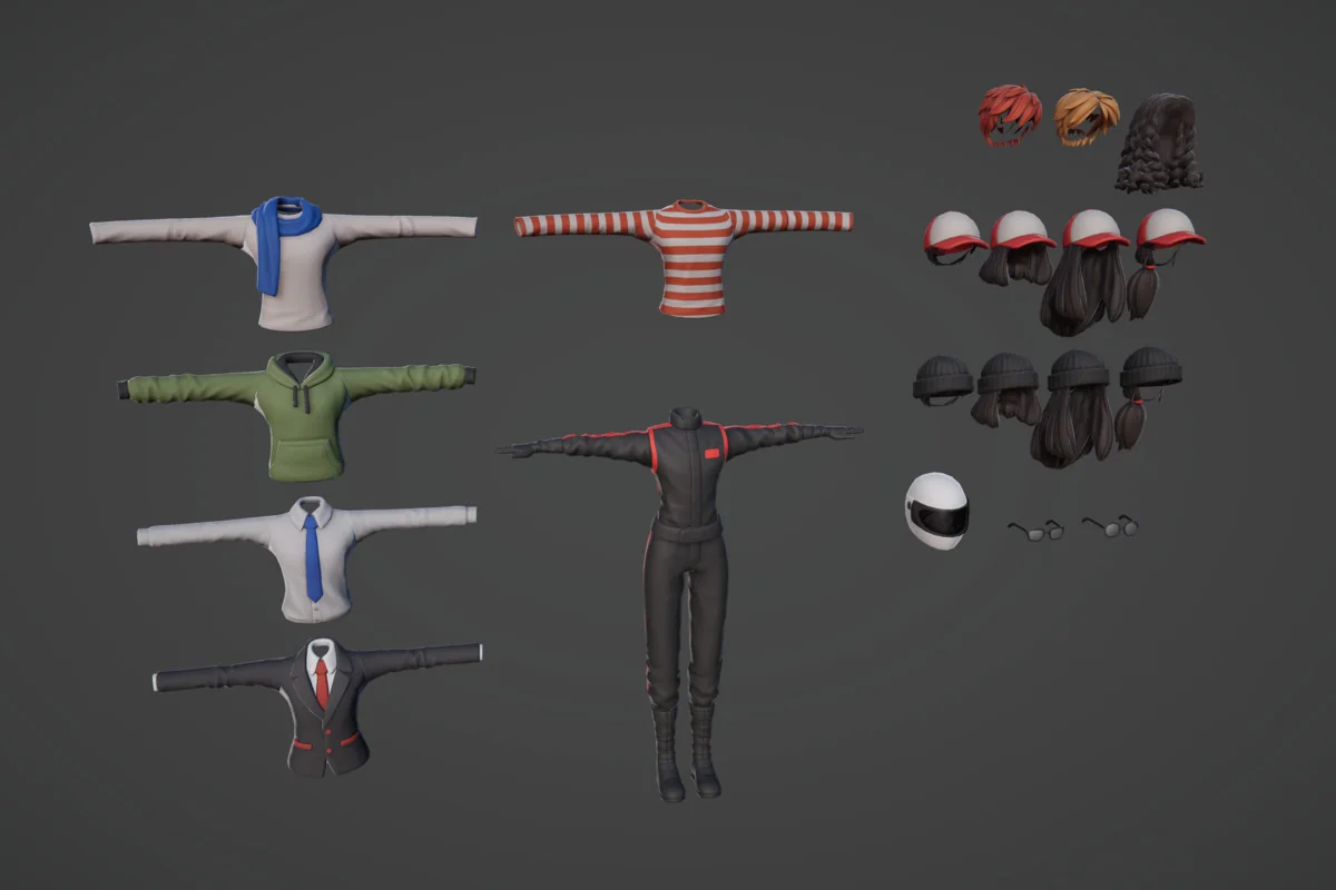 The Modular Stylized Character 1 provides a framework for creating diverse humanoid avatars through a system of interchangeable parts and body types. At its core, the package includes both male and female body types and rigs, serving as the foundation for a wide array of customization options. The asset includes 583 total assets, categorized into specific wardrobe and physical attributes to facilitate unique character combinations.