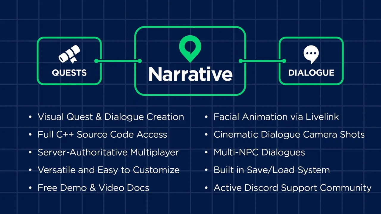 Even multiplayer games can use Narrative, because it ships with Server Authoritative Networking right out of the box. The Shared Quests system even allows multiple players to work on the same quest together if you need it.