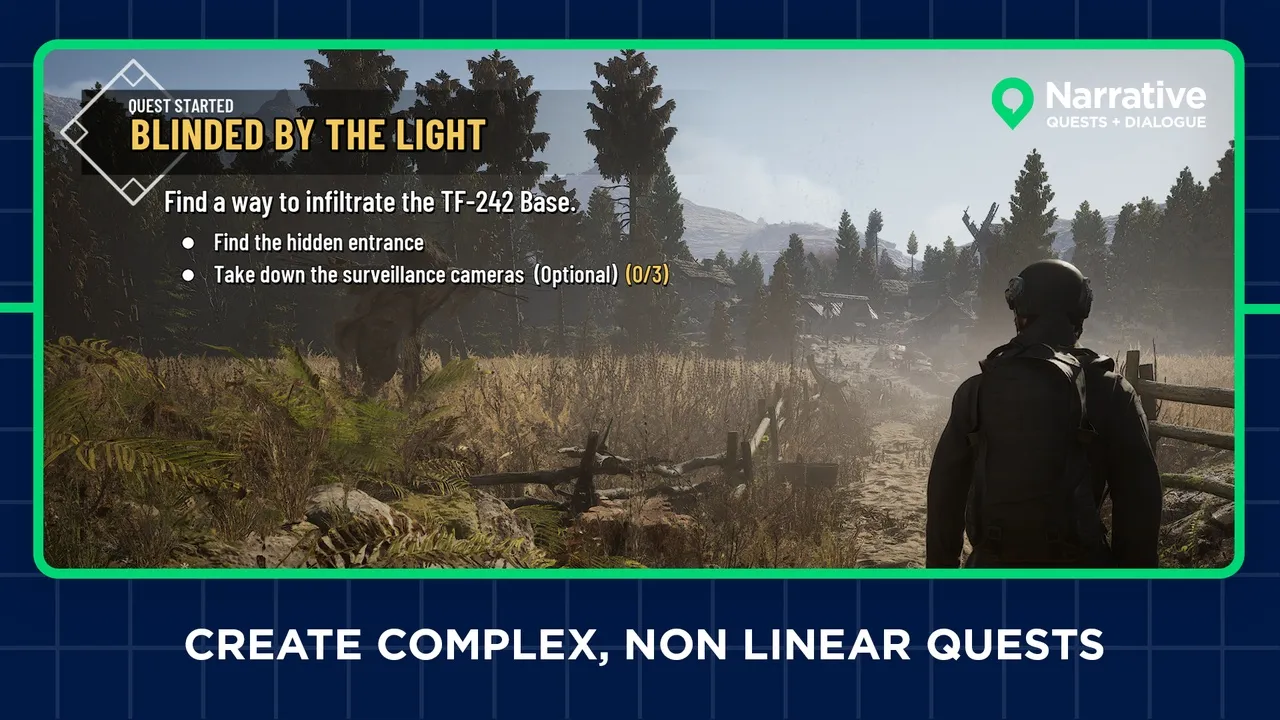 Most Quest systems let you make basic, “Kill 10 Wolves” type Quests but fall apart as soon as you need to make a more complex quest. Narratives uses a state machine based system that lets you create complex, non-linear quests. There is no quest you cannot create with Narrative.