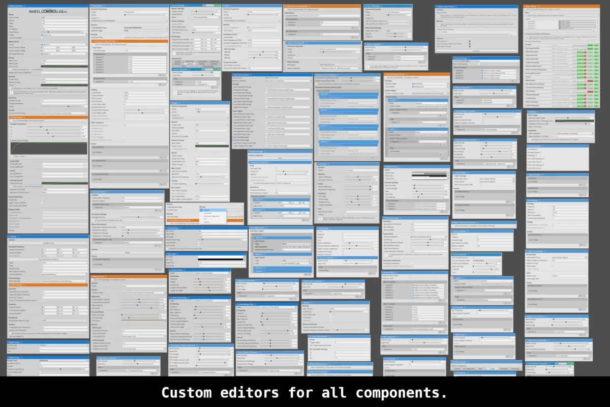 Custom editors are included for all scripts, and the package uses NUI, an editor GUI framework, to keep the visual experience consistent across the asset. That reduces the friction of navigating a large vehicle system, especially when a project depends on multiple modules and several interacting scripts.