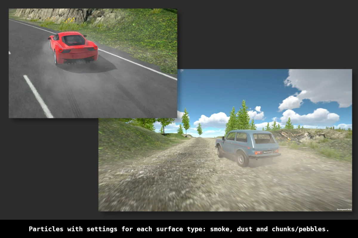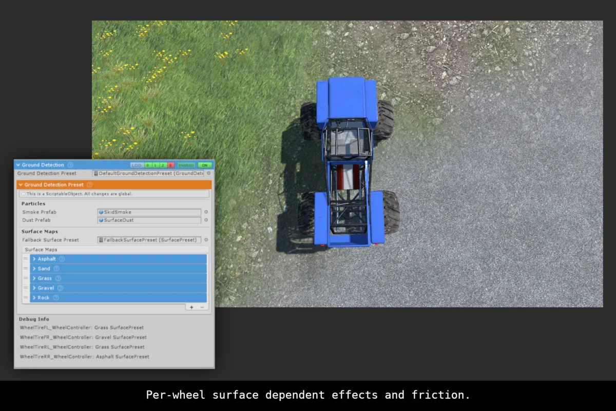 That combination makes the system useful in scenes where one vehicle is not enough. A project can move between vehicle types while keeping the same broader simulation framework, and the per-wheel surface detection gives each surface a distinct feel instead of flattening everything into a single friction response.