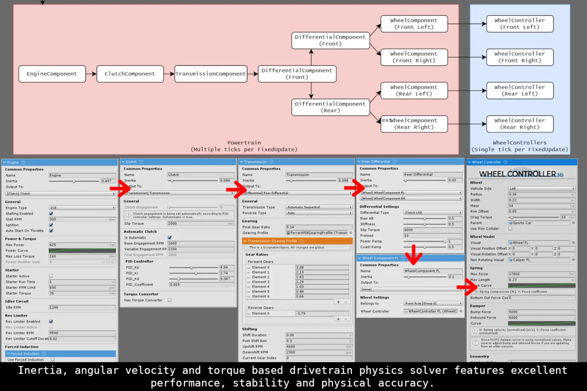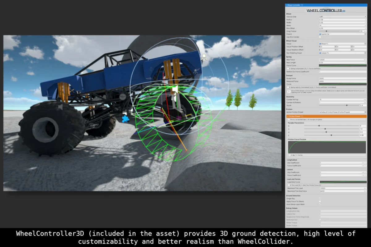 The asset also allows vehicle behavior to be adjusted at runtime. Suspension, friction, gearing, powertrain, and other values can be modified in real time, giving direct control over how a vehicle responds while the game is running. That kind of control is useful when a project needs tuning during development or when the vehicle itself has to change behavior in play.