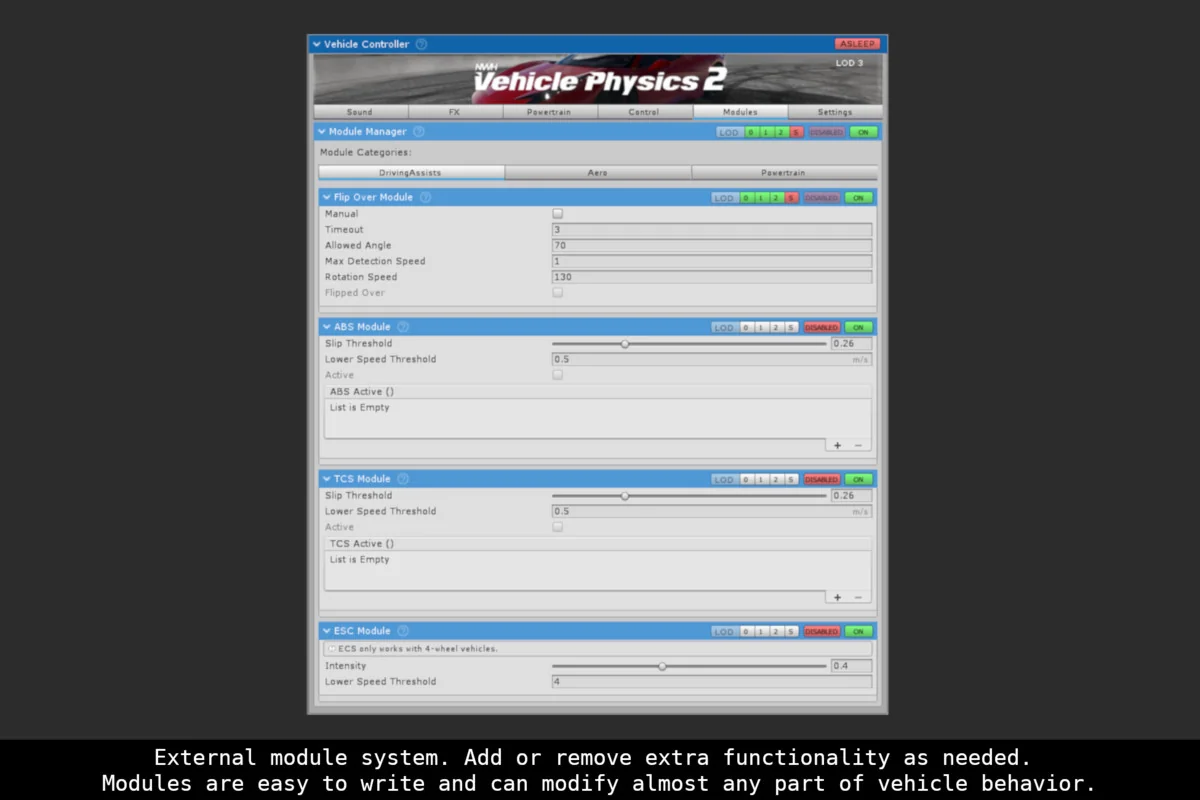The vehicle setup is not locked into one fixed structure. NWH Vehicle Physics 2 uses a modular architecture, so parts of a vehicle can be enabled or disabled as needed. That can happen manually or through the built-in LOD system, which makes the vehicle structure easier to scale without rebuilding the whole setup every time a scene needs a different level of detail.