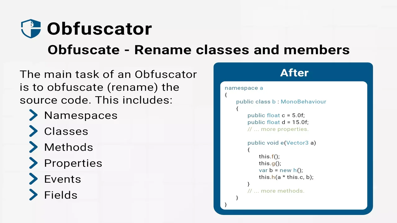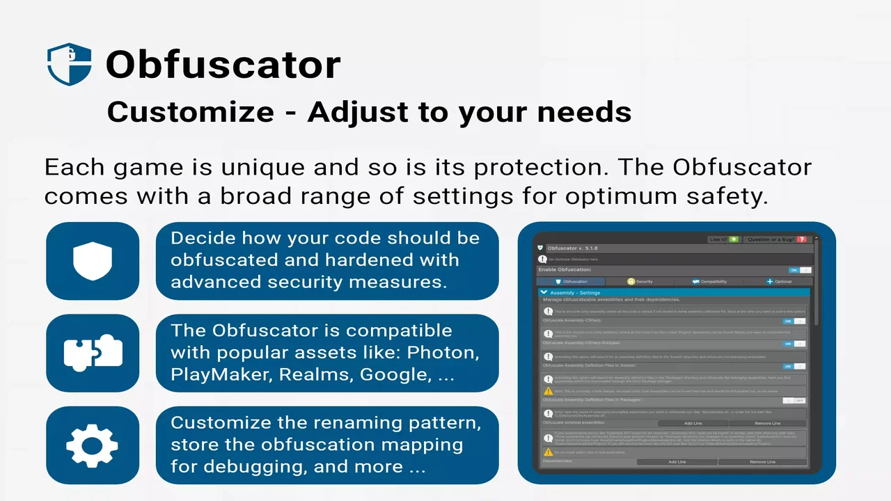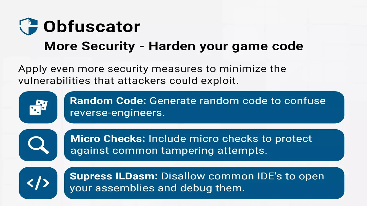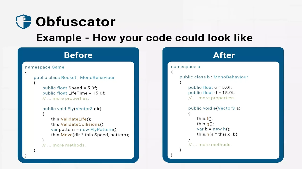 Obfuscator Pro was especially developed for Unity to increase your software and game security. Its main goal is to obscure your own source code and also compiled DotNet assemblies from third parties.
