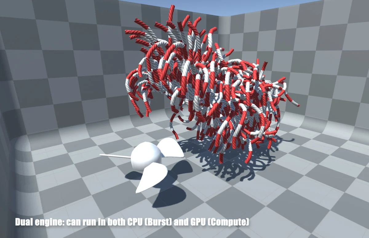 Obi Rope does not rely on rigid bodies and joints the way some rope solutions do. Its simulation is based on XPBD particles, which is presented as a lighter, more detailed, and unconditionally stable approach. That makes the structure of the system easy to read: the rope behaves as a particle simulation first, not as a chain of linked rigid bodies.