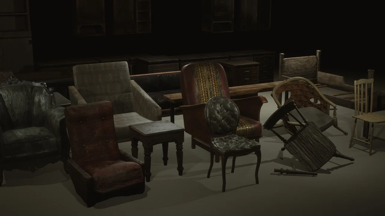A collection of 23 old abandoned furniture: sofa, chairs, tables.