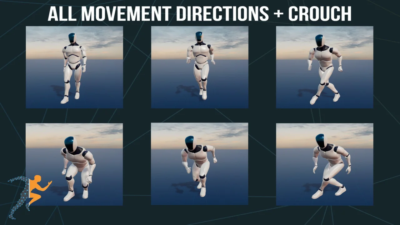 - 74 Core Locomotion Animations: A comprehensive library covering essential movements like walking, jogging, running, turning, strafing, and more.
