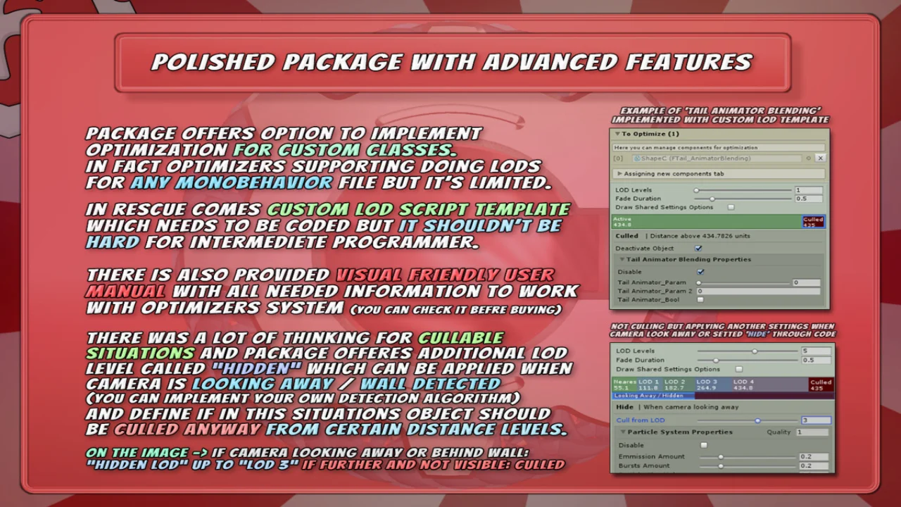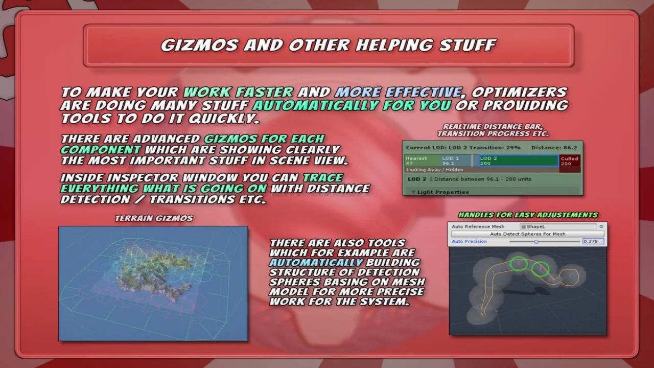 With easy to use Optimizers’ custom inspector window you will set up your Level Of Detail settings without need to know much about optimizing.
