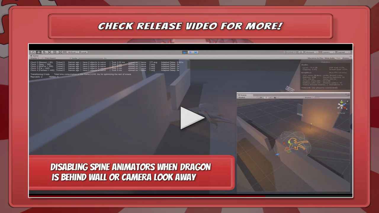 Apply different settings when object is hidden behind wall, cull if behind wall and a bit further, you have a lot of possibilities to adjust optimization behaviors for your project. Manager is progressively and intelligently adapting it’s CPU usage to the project’s global performance. When you will use tons of dynamic optimizer objects it’s update rate will imperceptibly slow down to never take any FPS from your project by it’s work, only give more!