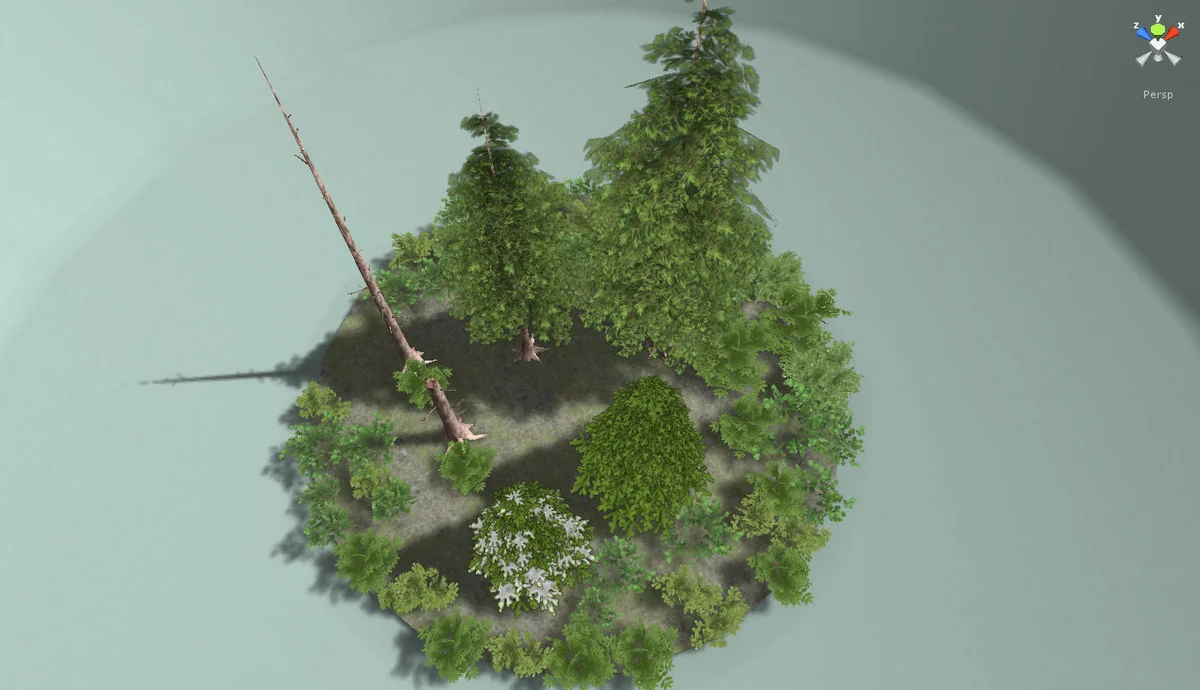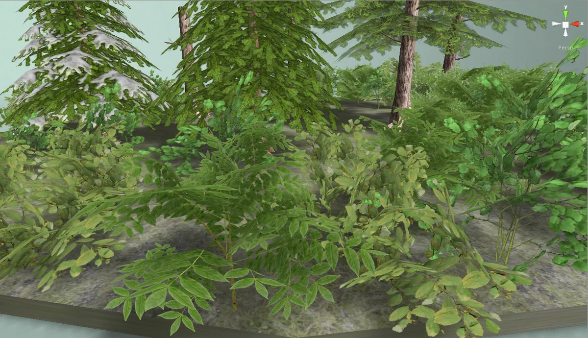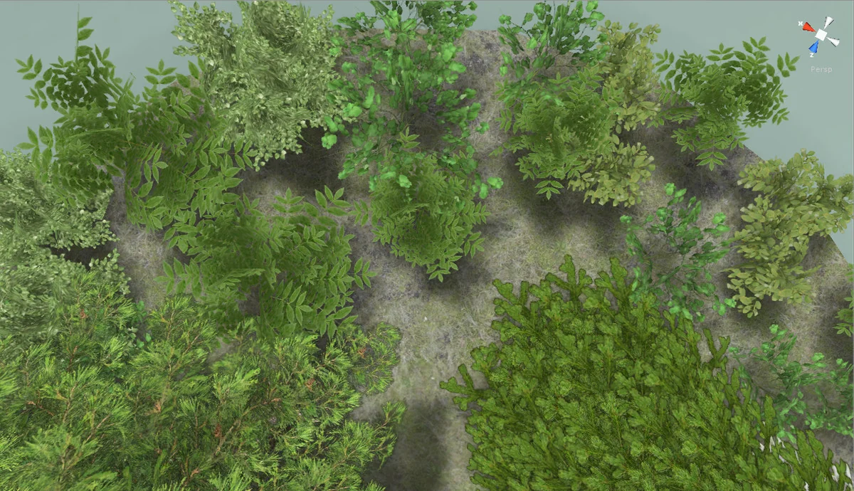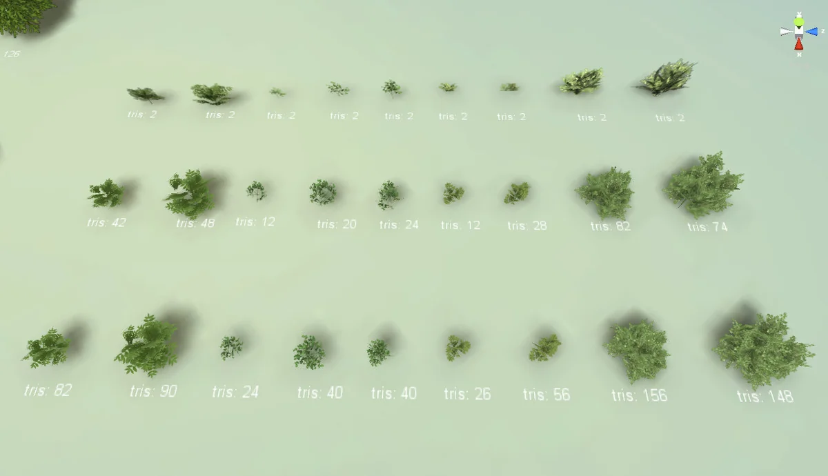 Every bush model in the collection eventually resolves to a 2-triangle billboard or simplified proxy at its lowest LOD level, ensuring that even large quantities of undergrowth do not overwhelm the GPU.