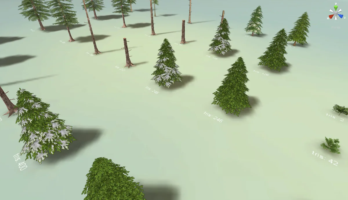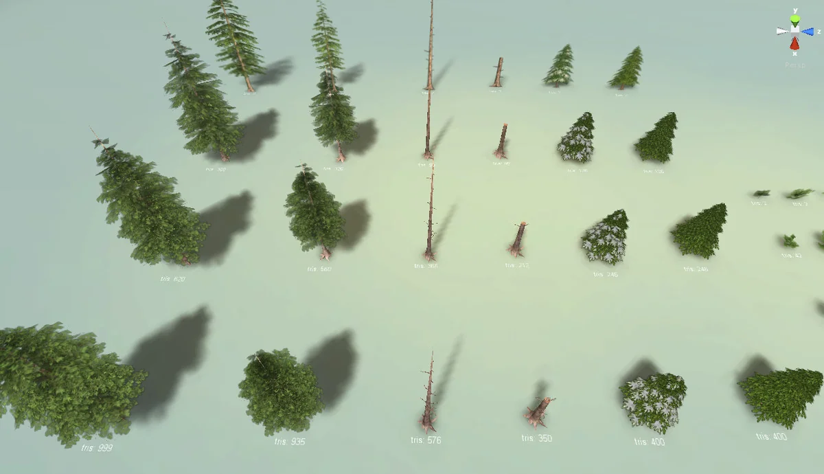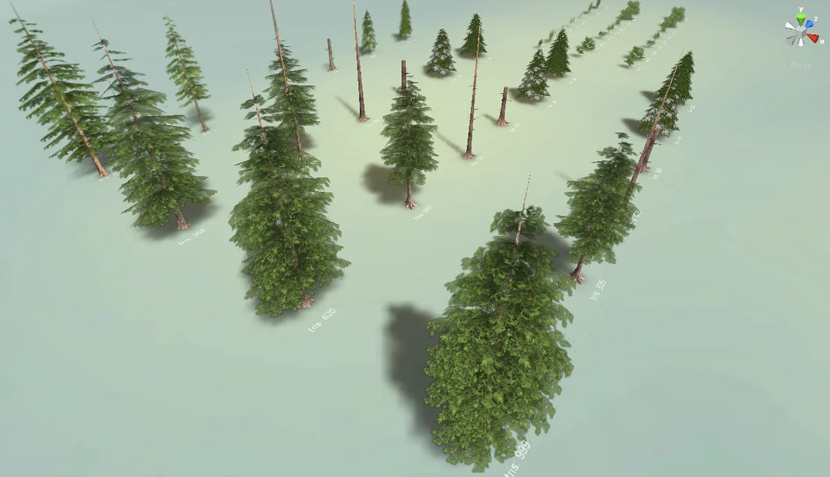 The pine trees transition through three LOD levels, significantly dropping triangle counts to preserve frame rates. For instance, the first pine model begins at 999 triangles and scales down to 620 and 358, eventually reaching a mere 2 triangles at its furthest distance. The second pine follows a similar pattern, starting at 935 and reducing to 2 triangles. Smaller pine models (Pine 3 and 4) are even leaner, starting at 400 triangles and dropping to 126 before reaching the final 2-triangle stage.