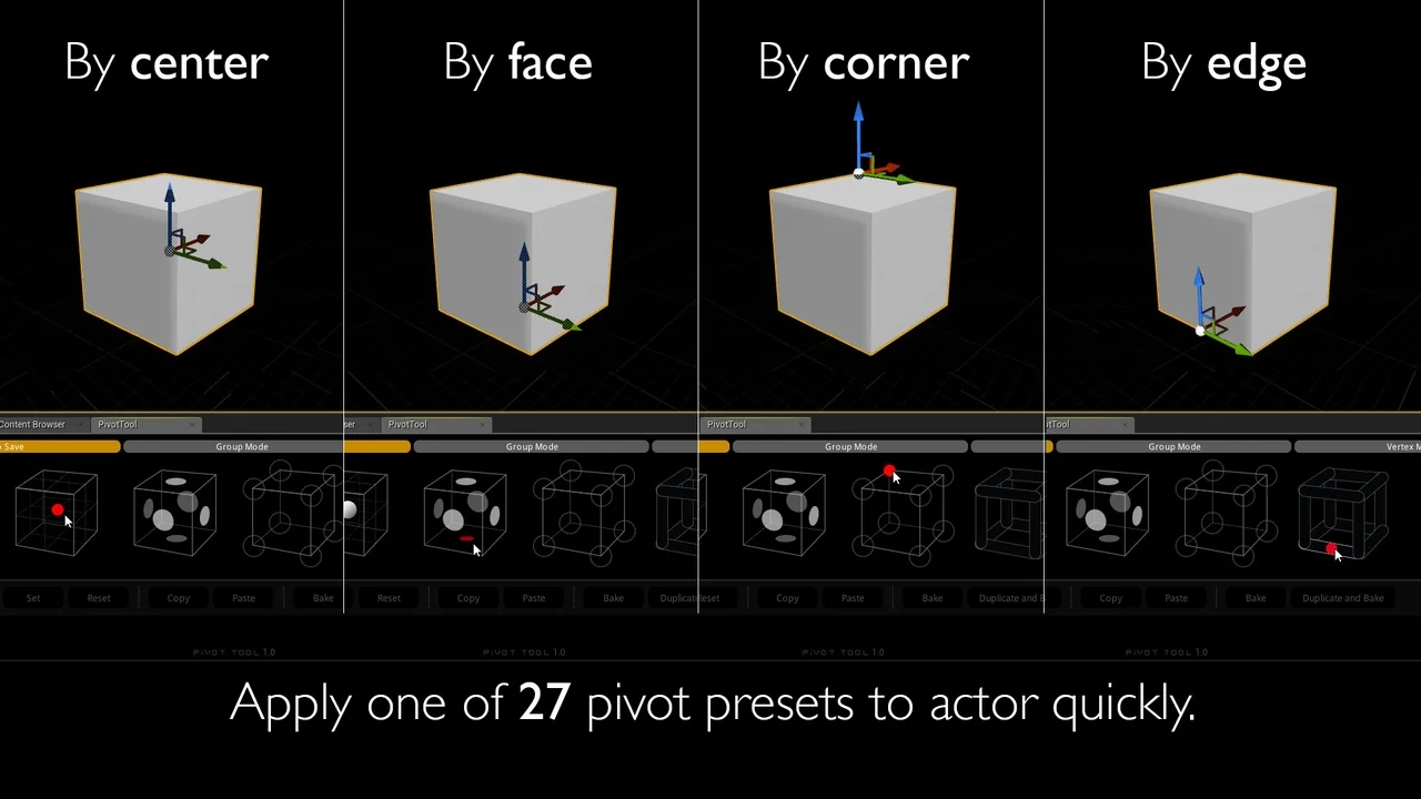 The tool provides two primary methods for adjustment. Users can choose to modify pivots manually for precise control over specific actors. Alternatively, the developer has included 27 pivot presets for automatic application. These presets allow for rapid alignment based on common placement needs, ensuring that your objects behave correctly during the layout phase.