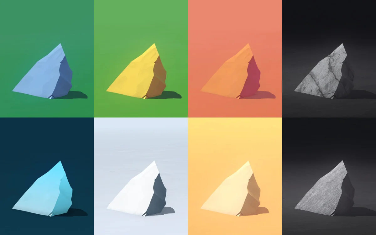 To accommodate different shading workflows and performance needs, assets are provided in three distinct versions: standard, multimat, and layered. These variations allow developers to choose the most efficient setup for their specific rendering pipeline. The assets are designed to scale elegantly in any direction, maintaining their visual integrity even when stretched or resized to fit specific level design needs. This scalability, combined with the way the geometry reacts to light, allows the pieces to be used in various lighting environments without losing their defined low-poly silhouette.
