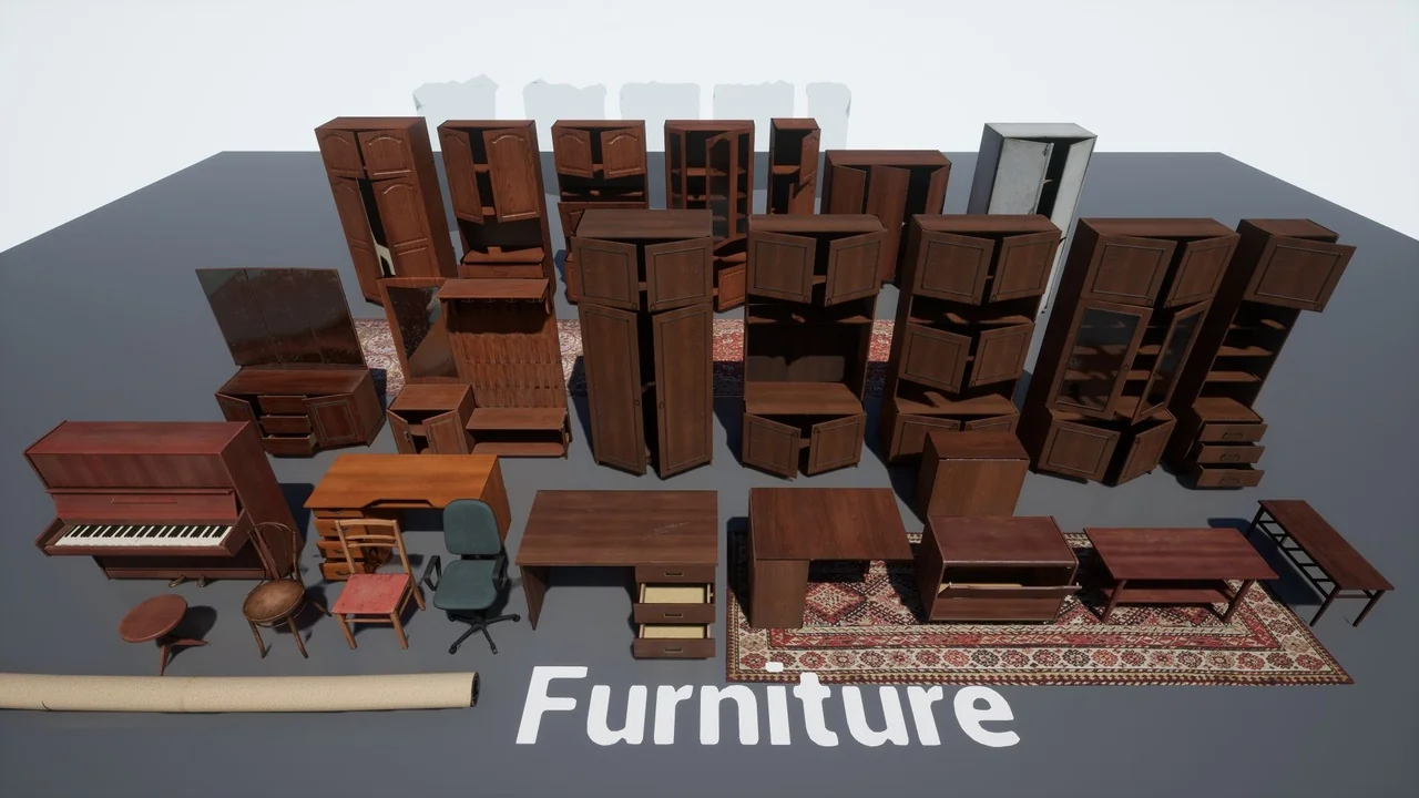 Post Soviet Furniture works best when it is treated as part of an interior environment rather than as a collection of isolated props. The pack brings together Russian and Eastern European furniture types that already feel like they belong in the same space, so a scene can be arranged around them without needing to force visual consistency afterward. Cupboards, chairs, a piano, carpets, tables, and coffee tables can be staged together as everyday room pieces, then used to shape how a player reads the space from the first glance.